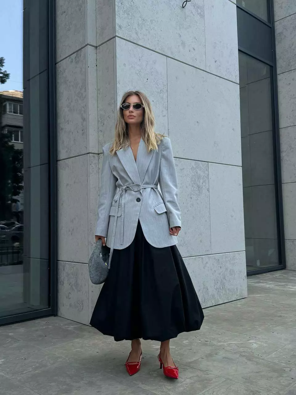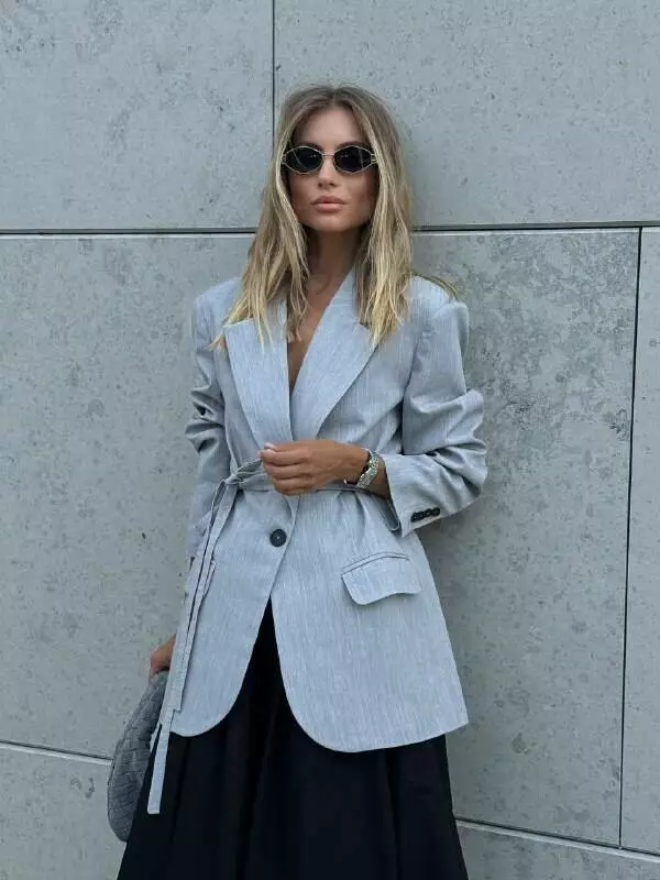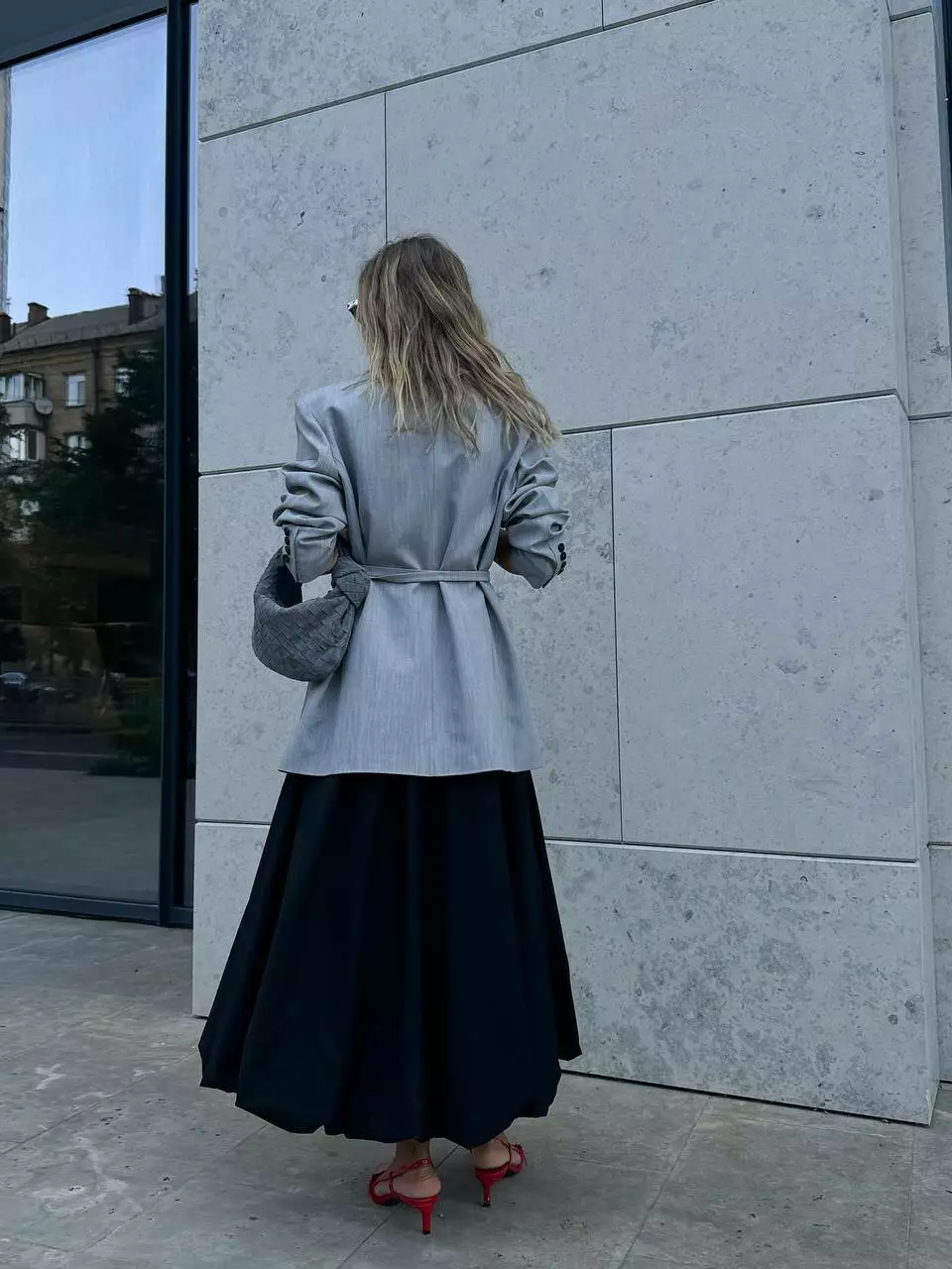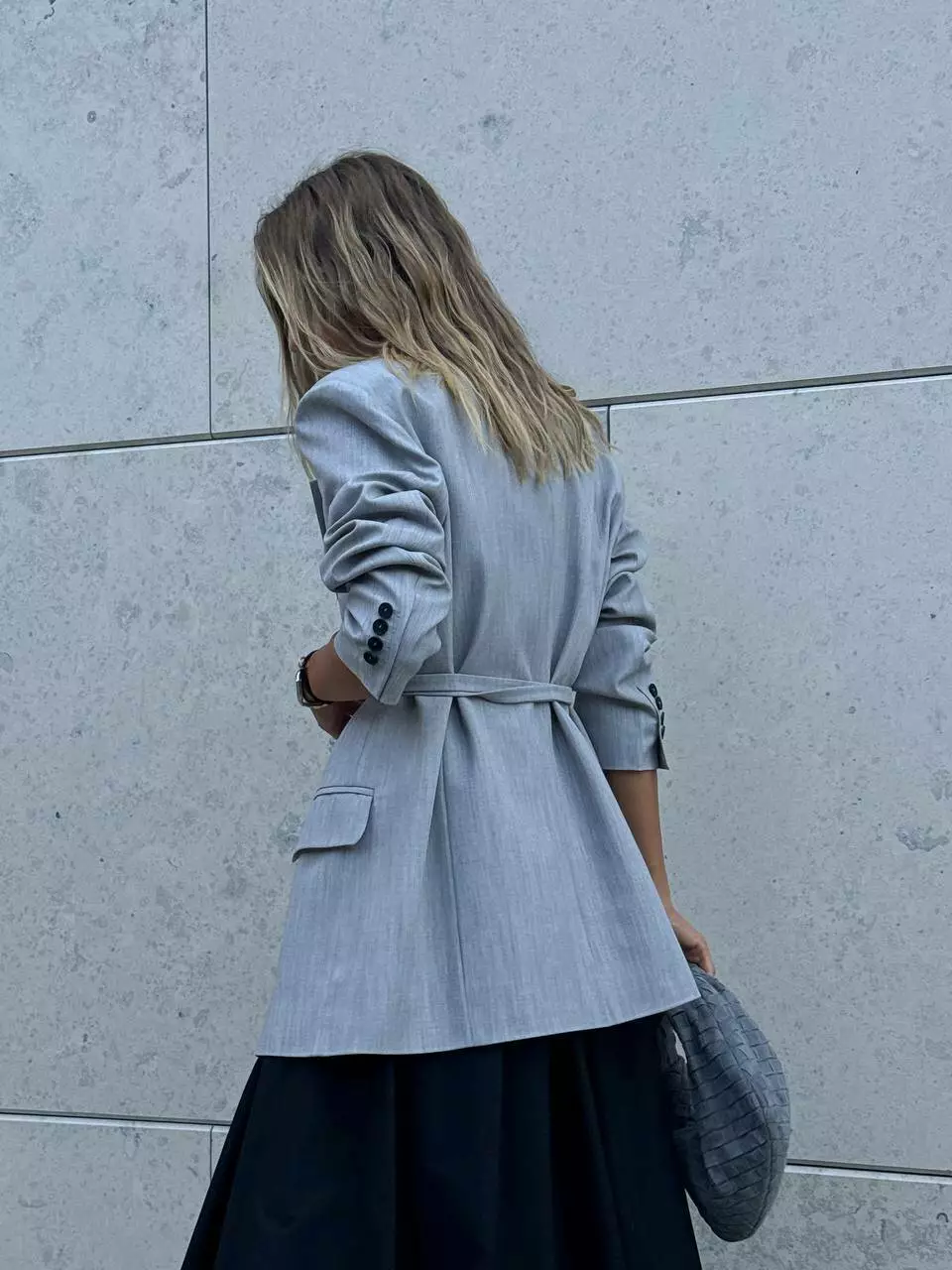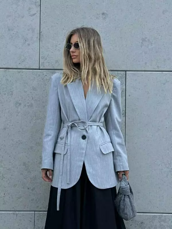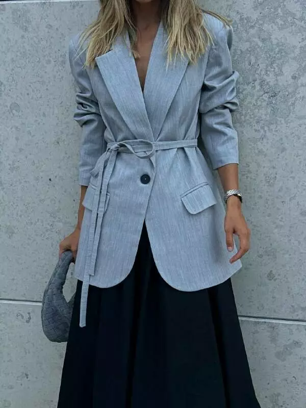 Стильний класичний піджак виконаний із преміальної костюмної тканини. Піджак прямого крою, подовжений, з обʼємними плечима і 2 діючими кармани. В комплекті тонкий пояс -шнурівка.