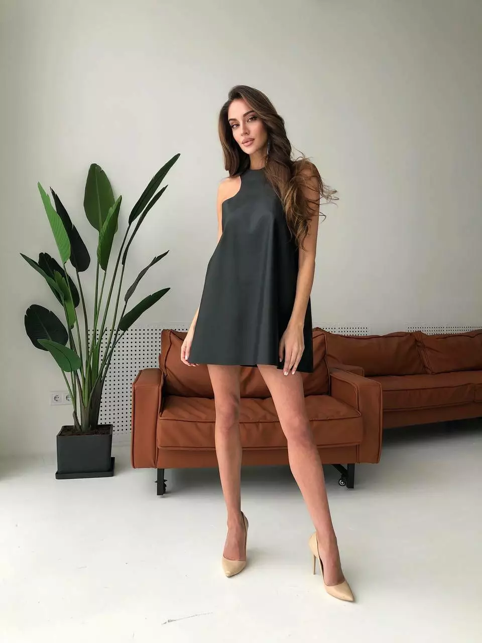 Стильна сукня міні MARANI з екошкіри lux зроблена з розкльошеним вільним кроєм трапеції Головний акцент вбрання – горловина халтер, що відкриває плечі та ключиці Зворотний бік на замшевій основі - приємний та м'який, блискавка знаходиться на спинці
