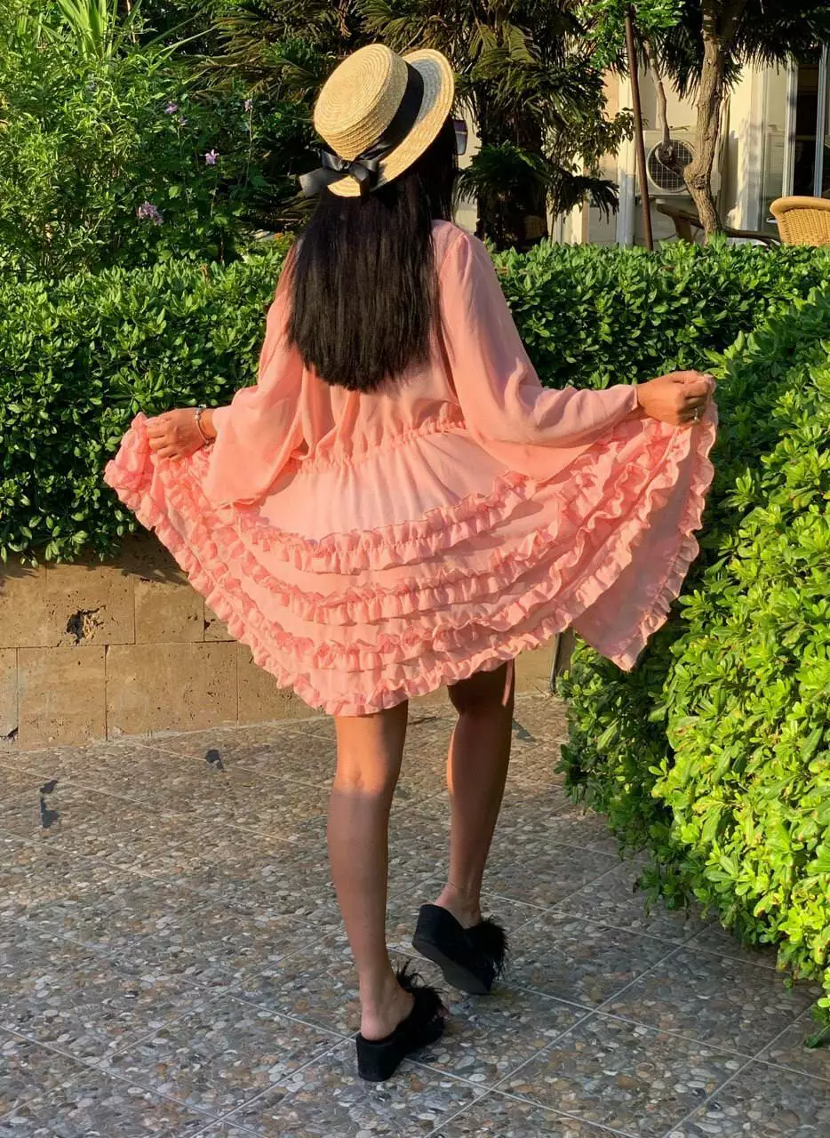 Шифоновий пляжний халат з оборками по юбці, рукав 3-4 флангом, таліч на кулісці