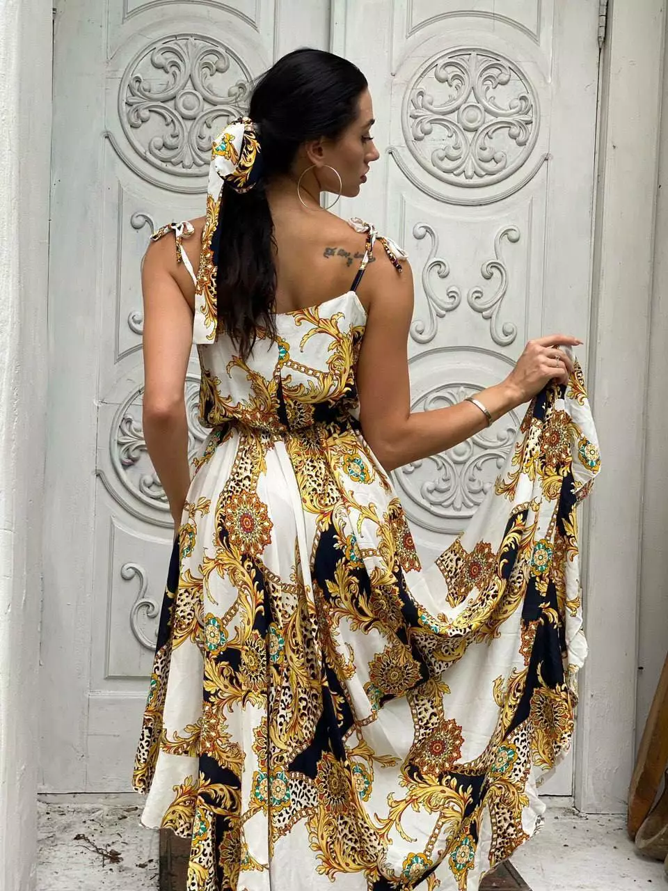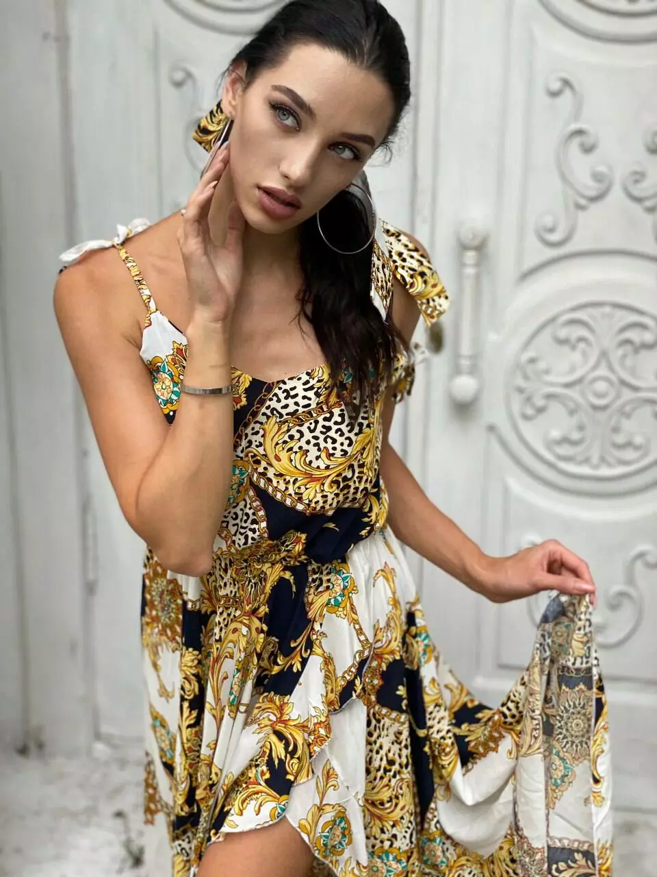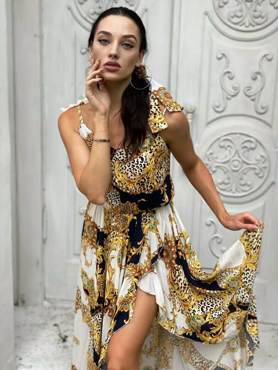 Літній сарафан асиметричного крою з рюшами по спідниці.
