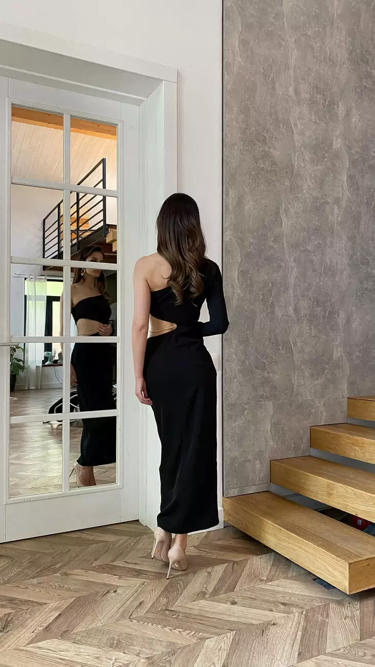 Сексуальна сукня ETOILE з елементами стриманості, асиметричне декольте та пікантний виріз по талії разом з глибоким розрізом по спідниці попереду робить неповторний образ будь-якої красуні.