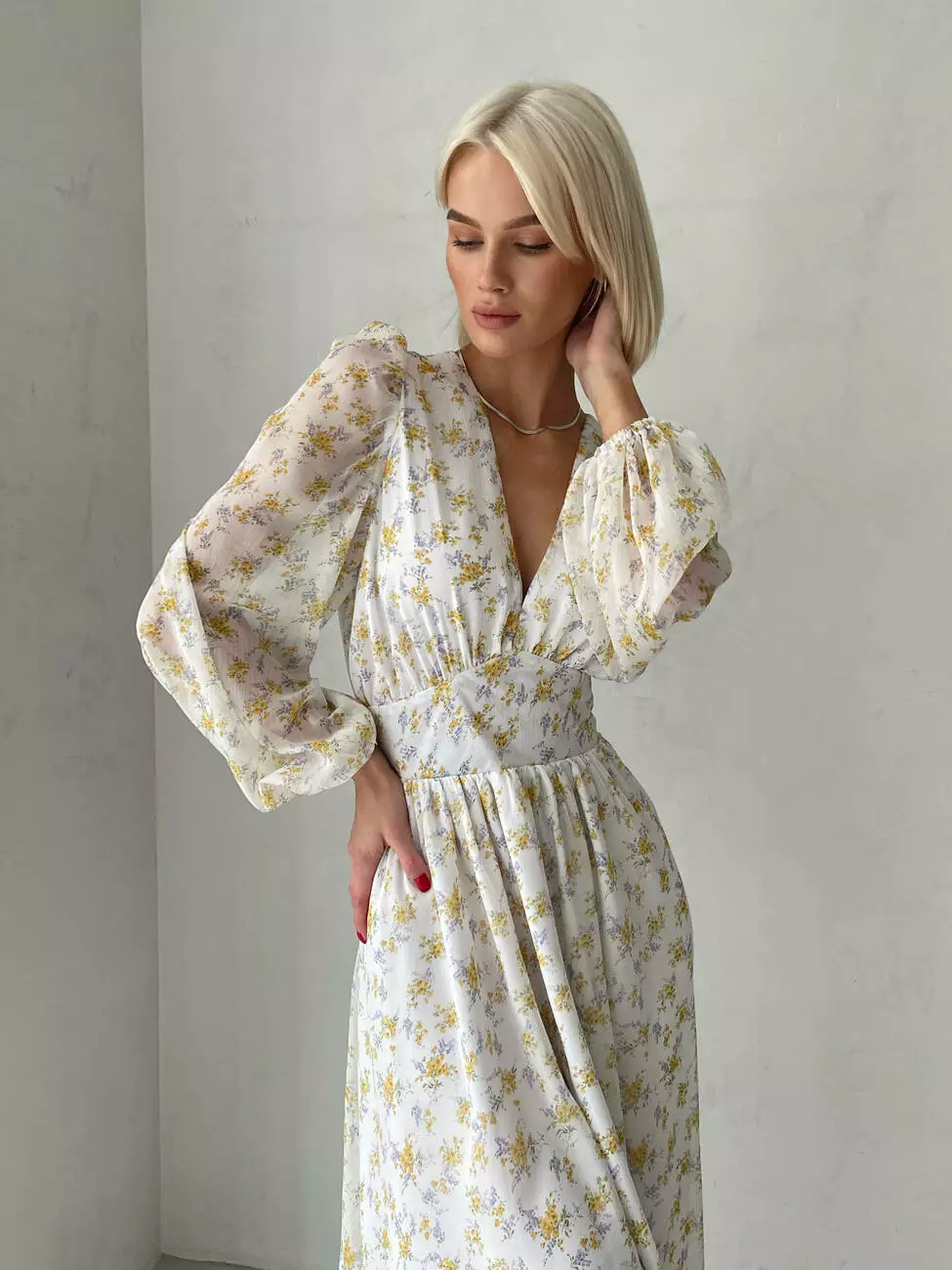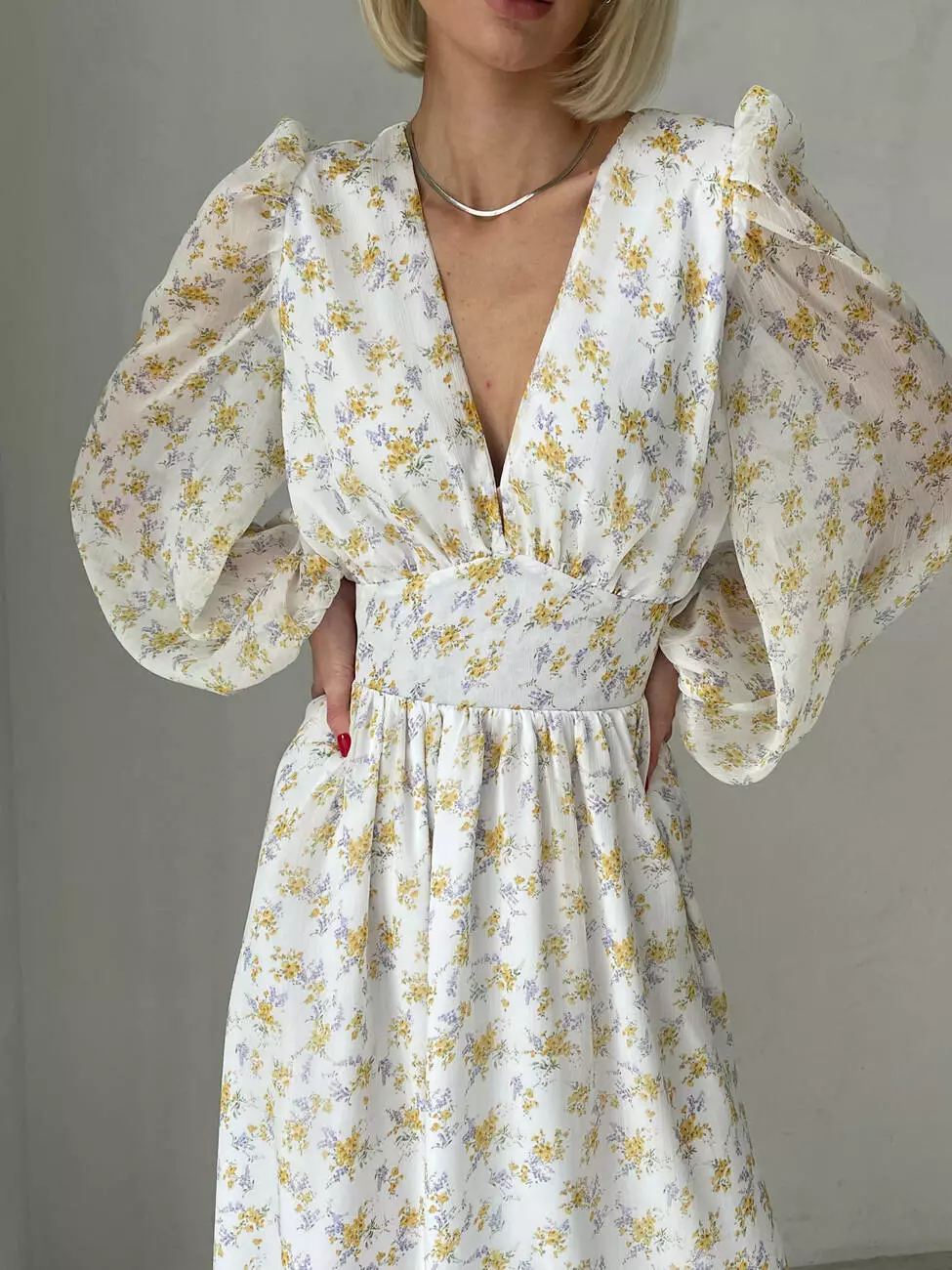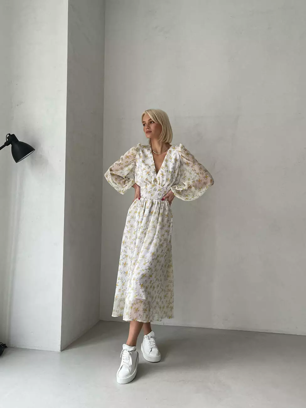 Шифонова сукня VIOLA міді з квітковим принтом та V-подібним вирізом розмір 42-46 квіти на білому