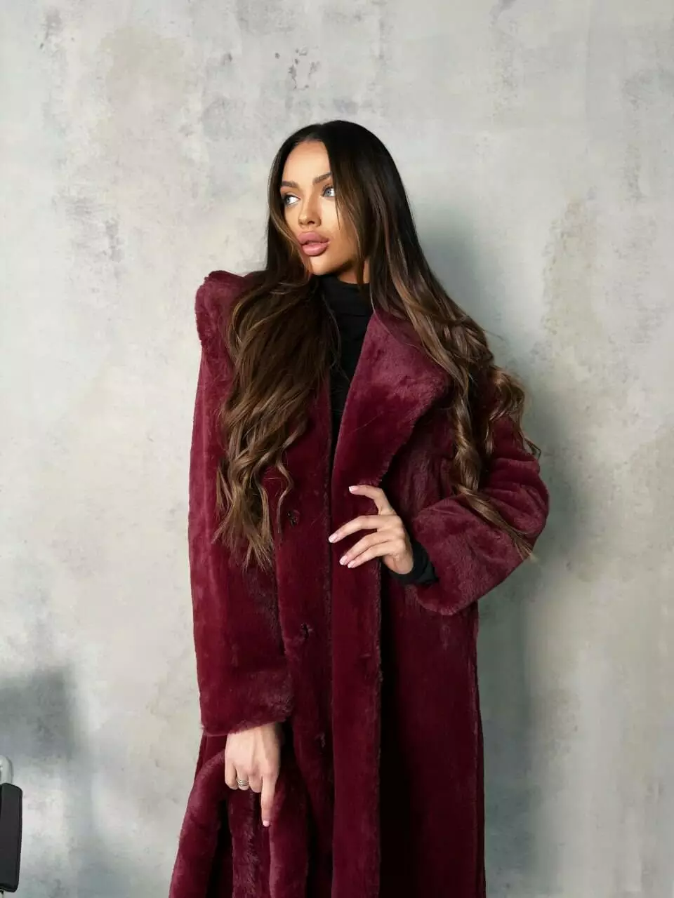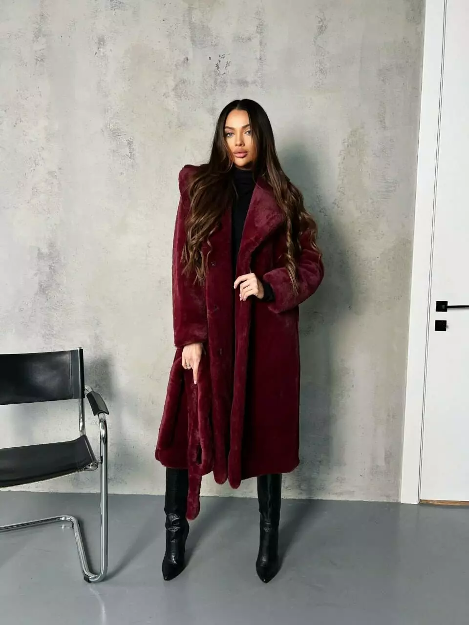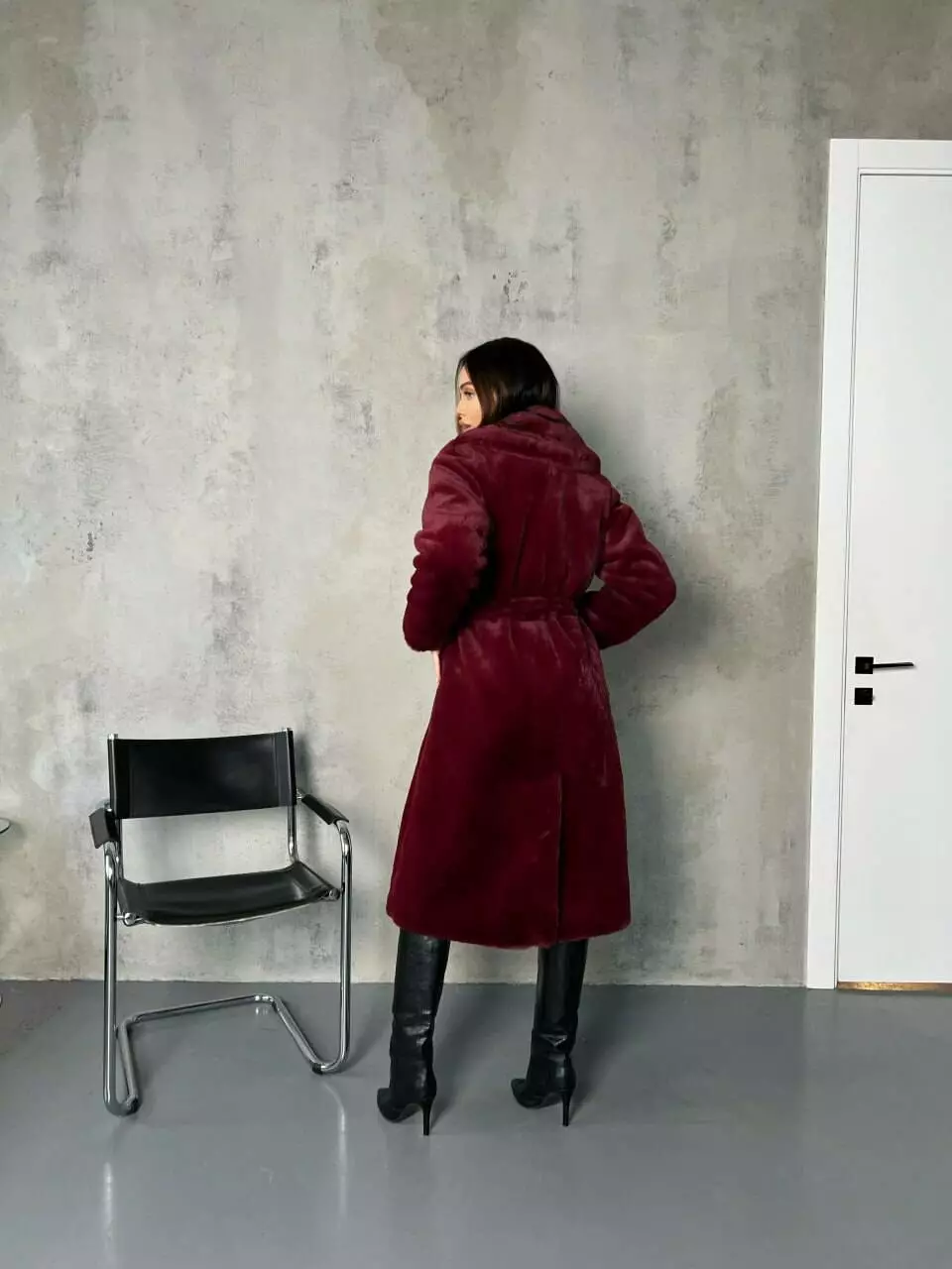 Тепла затишна шуба MIDI оснащена внутрішнім атласним підкладом і має дві кишені в бічних швах та одну внутрішню кишеню Модель застібається поясом в тон