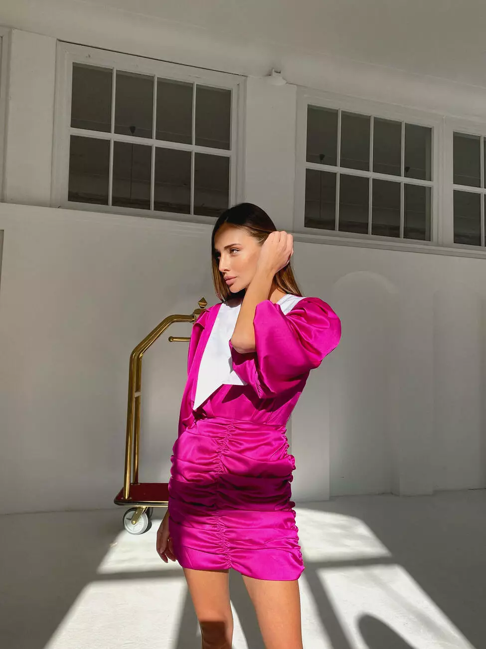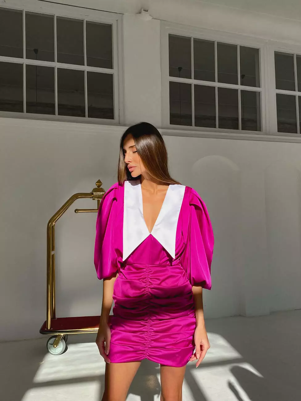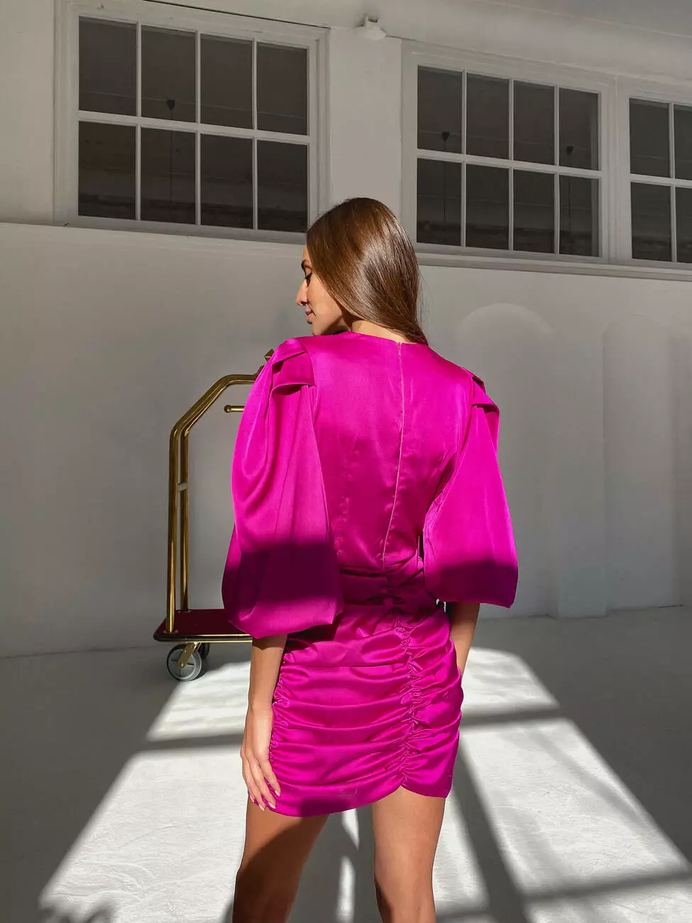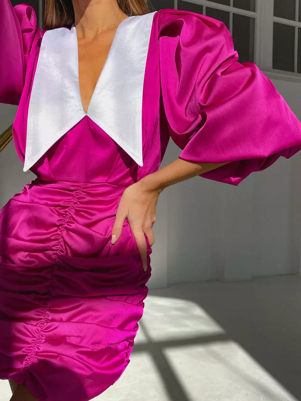 Стильна трендова шовкова міні сукня Kamilla з відкладним комірцем та V-подібним декольте колір фуксія