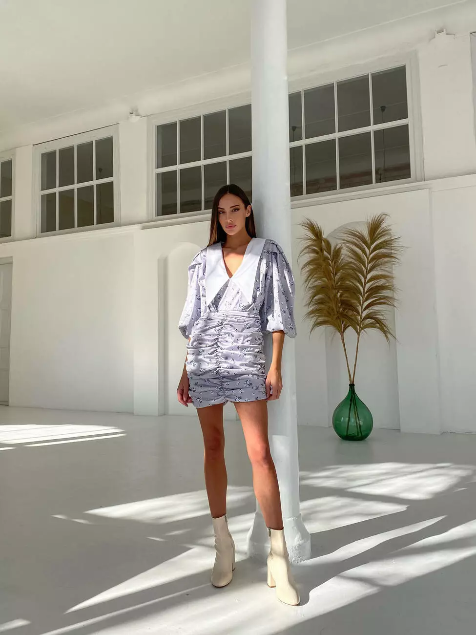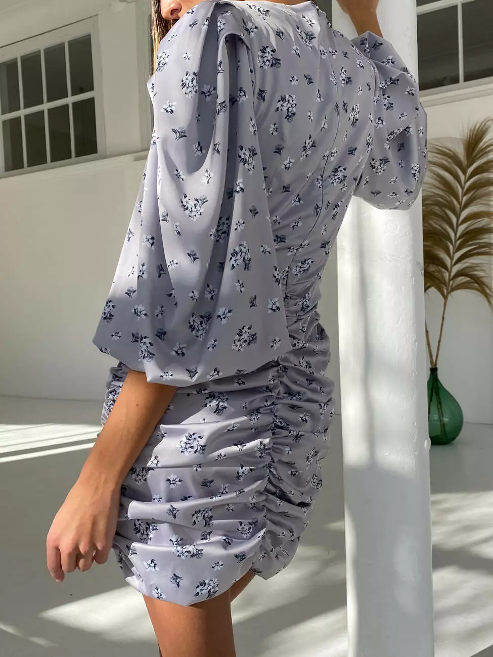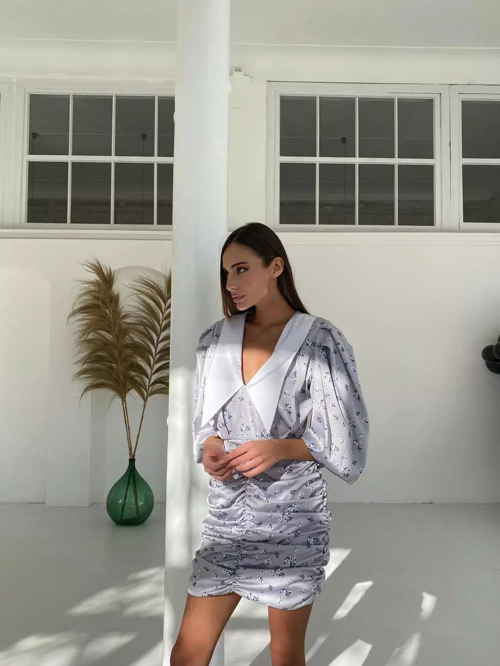 Стильна трендова шовкова міні сукня Kamilla з відкладним комірцем та V-подібним декольте сірого кольору квітковий принт