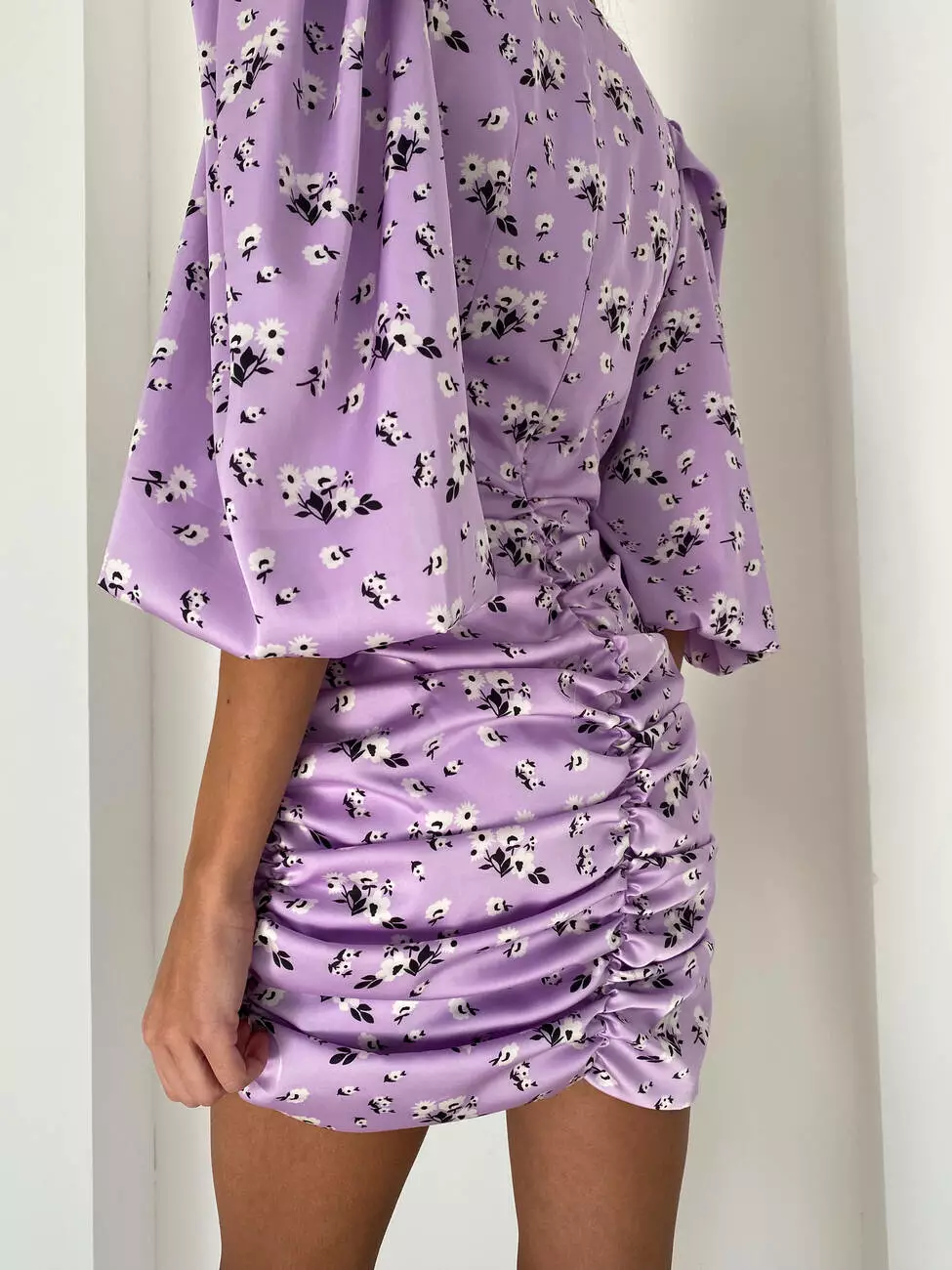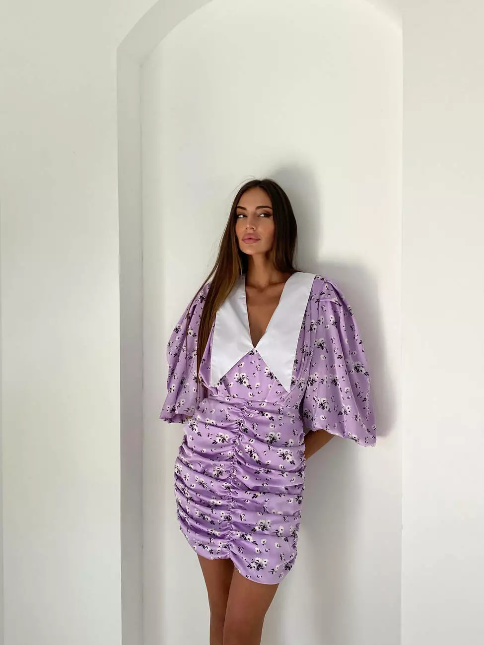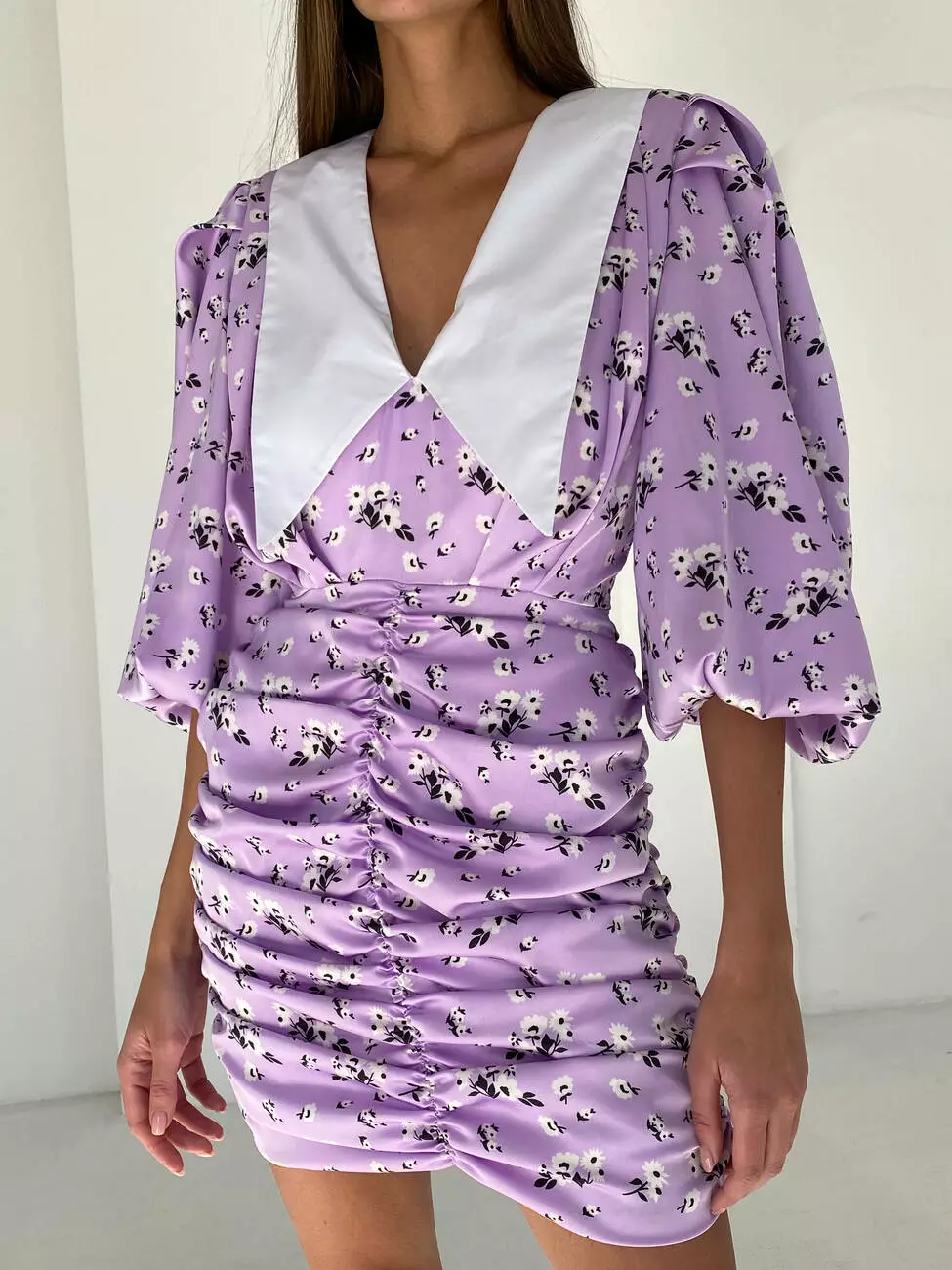 Стильна трендова шовкова міні сукня Kamilla з відкладним комірцем та V-подібним декольте лілового кольору квітковий принт