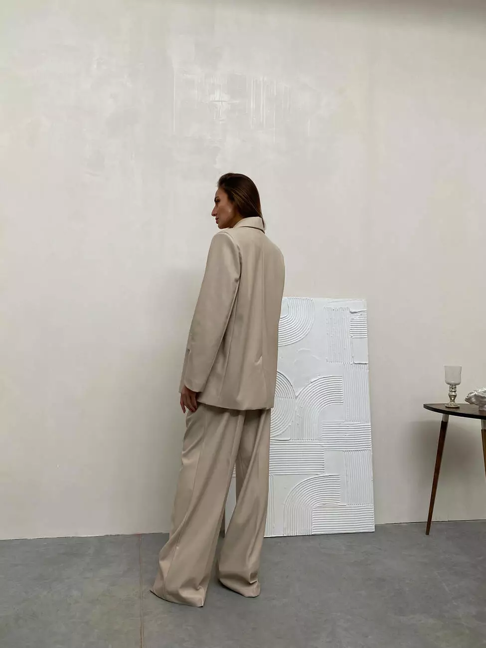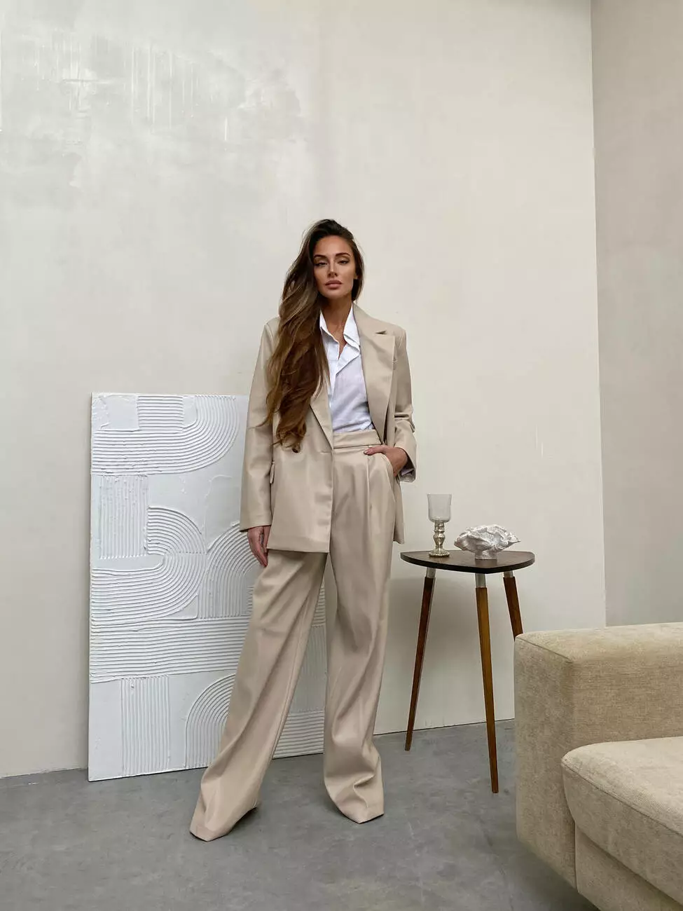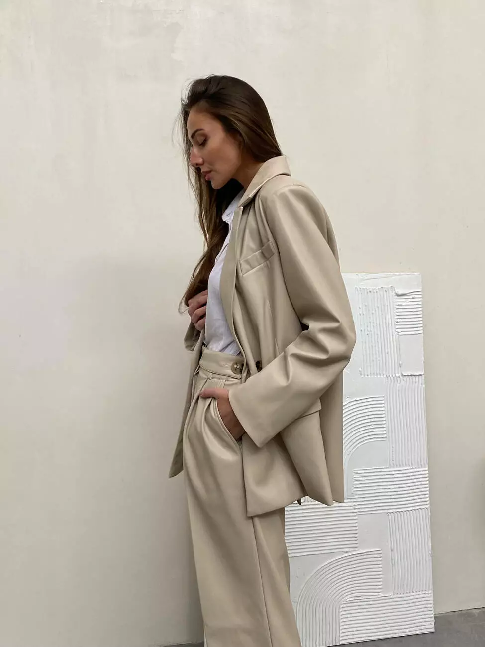 Стильний класичний костюм ALEX з екошкіри в стилі оверсайз колір світлий беж