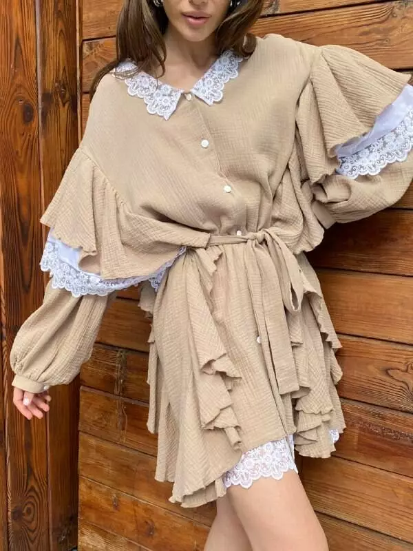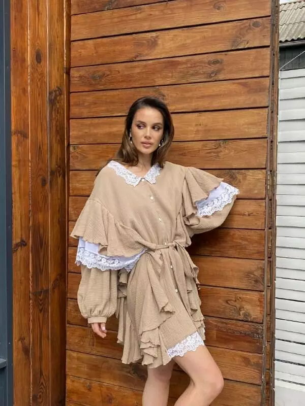 Бавовняна сукня з мереживом має вільний крій і тому має чудовий вигляд на будь-якій фігурі, має волани на рукавах і застібається на ґудзики Повітряна сукня в стилі орнаментів прикрашена мереживами на комірі, рукавах та знизу виробу, пояс в тон йде у комплекті