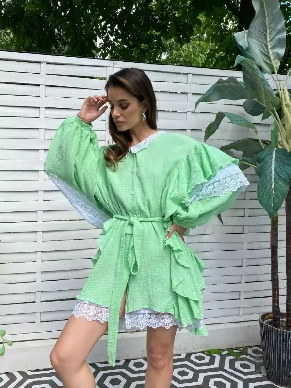 Бавовняна сукня з мереживом має вільний крій і тому має чудовий вигляд на будь-якій фігурі, має волани на рукавах і застібається на ґудзики Повітряна сукня в стилі орнаментів прикрашена мереживами на комірі, рукавах та знизу виробу, пояс в тон йде у комплекті