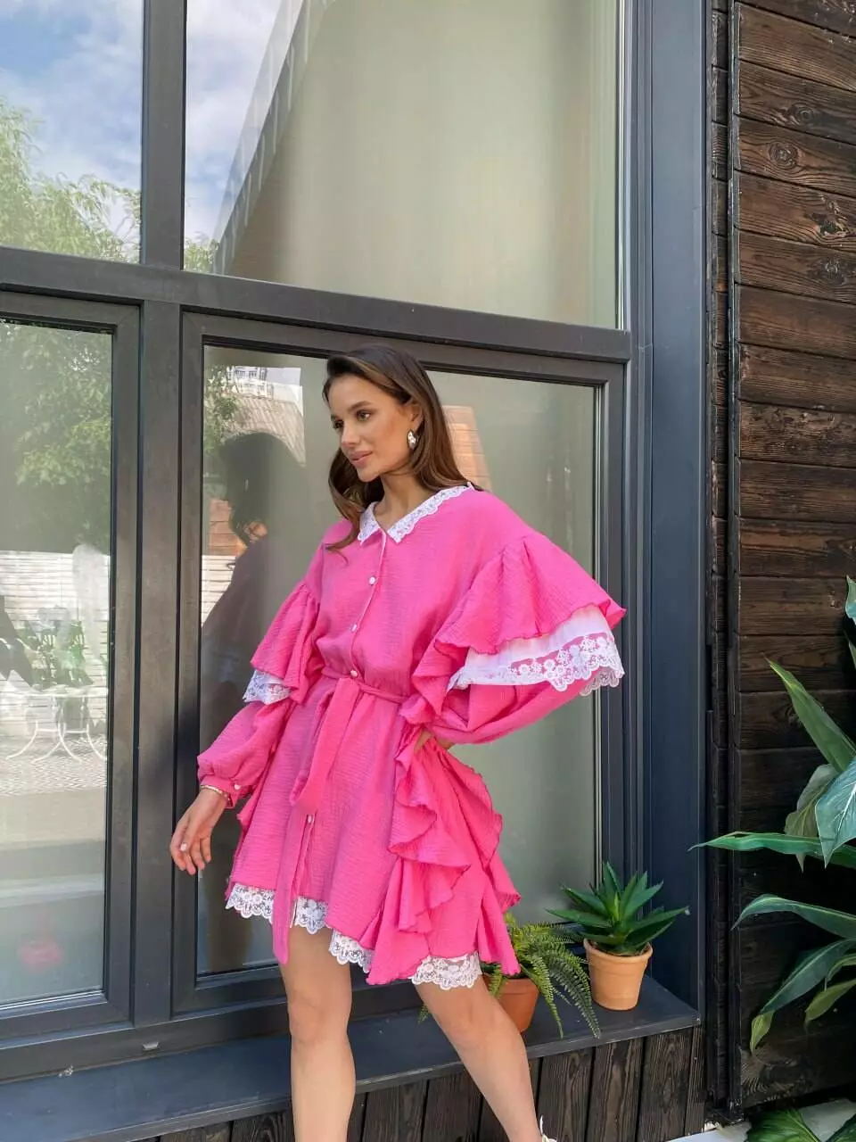 Бавовняна сукня з мереживом має вільний крій і тому має чудовий вигляд на будь-якій фігурі, має волани на рукавах і застібається на ґудзики Повітряна сукня в стилі орнаментів прикрашена мереживами на комірі, рукавах та знизу виробу, пояс в тон йде у комплекті