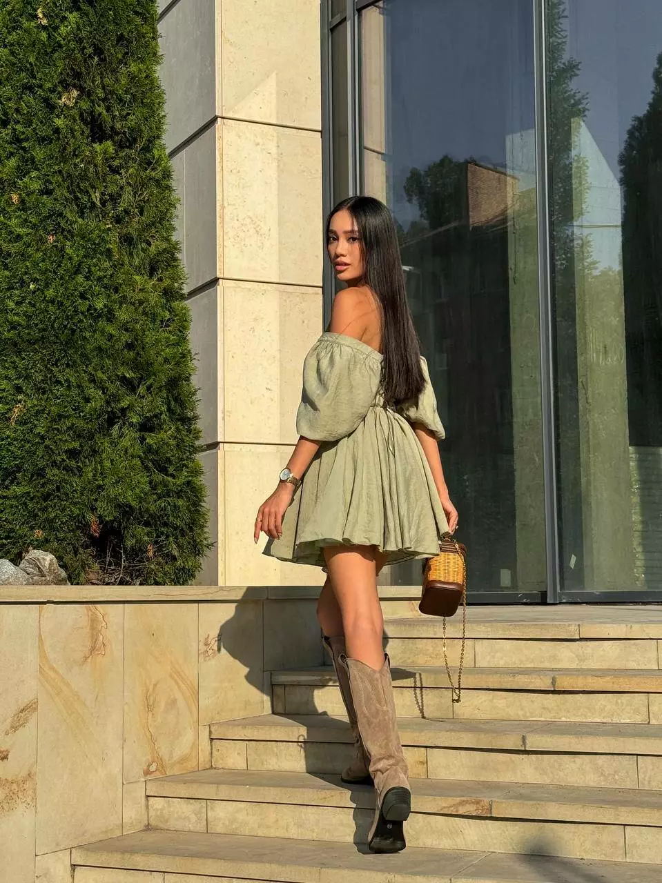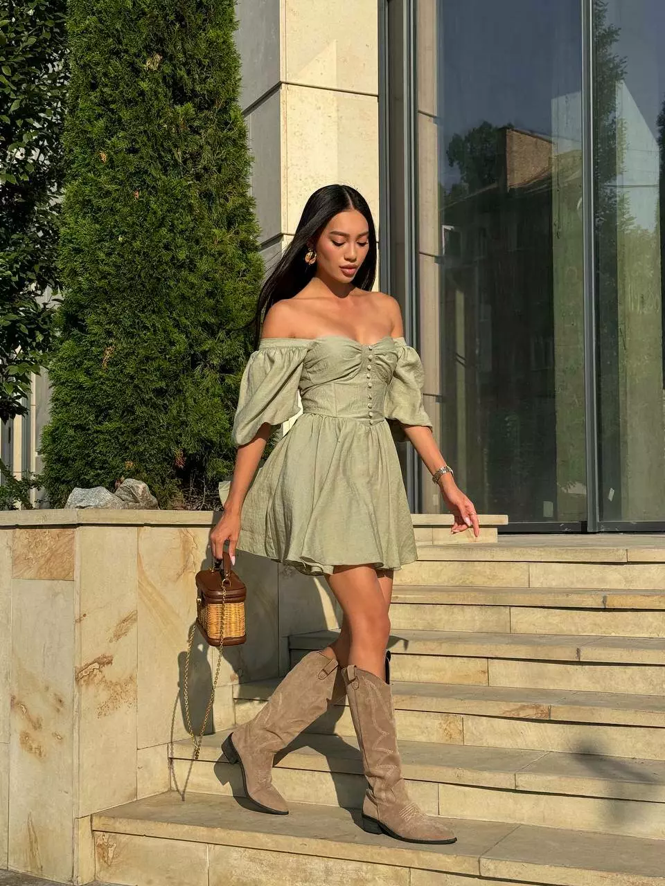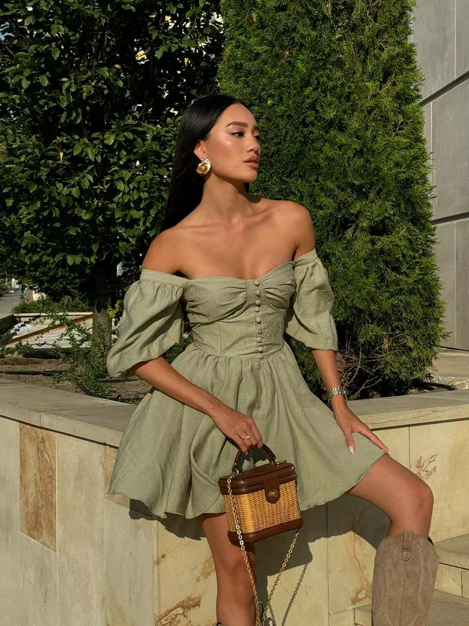 Тендітна корсетна сукня з мʼяким ліфом, обʼємними рукавами та пишною спідницею. Обʼєм сукні регулюється корсетною шнурівкою по спинці.