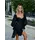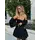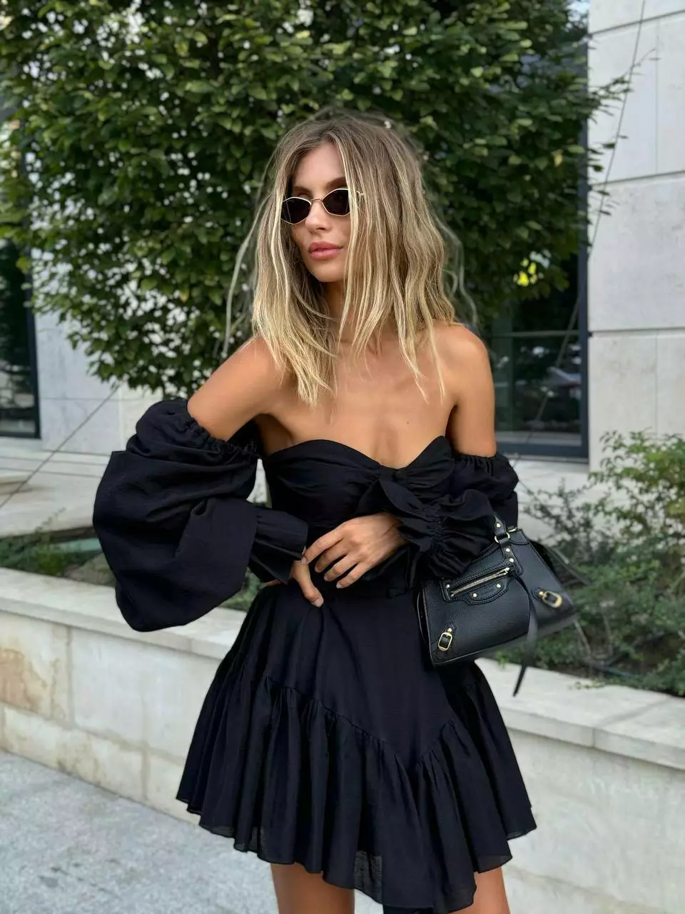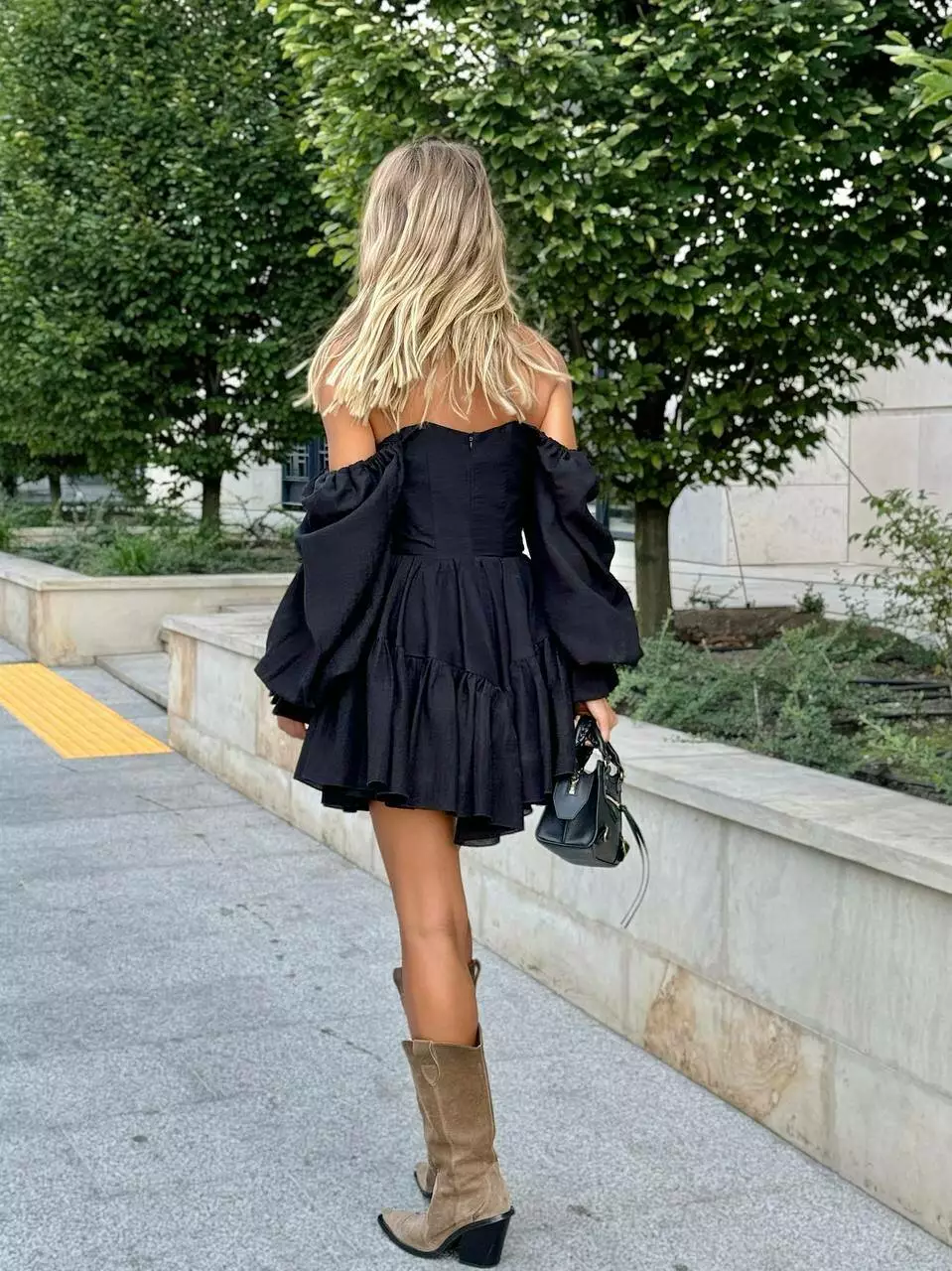 Тендітна сукня з мʼяким ліфом, декорована ґудзиками обтягнутими в тканину, з обʼємними рукавами та пишною не симетричною спідницею. Застібається по спинці потайною змійкою.