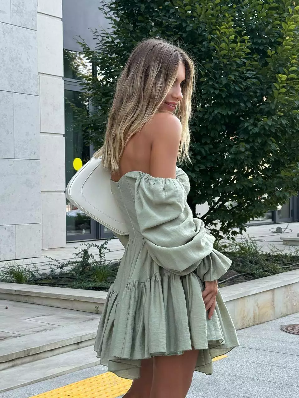 Тендітна сукня з мʼяким ліфом, декорована ґудзиками обтягнутими в тканину, з обʼємними рукавами та пишною не симетричною спідницею. Застібається по спинці потайною змійкою.
