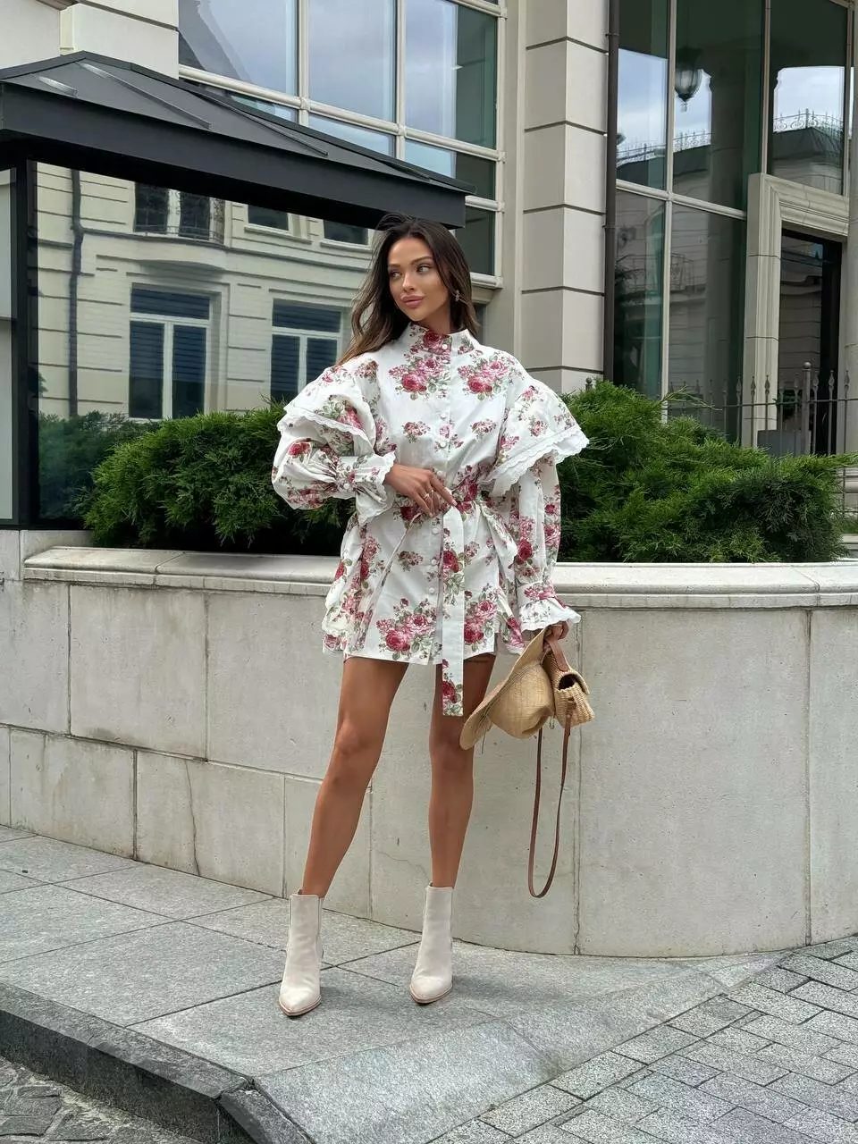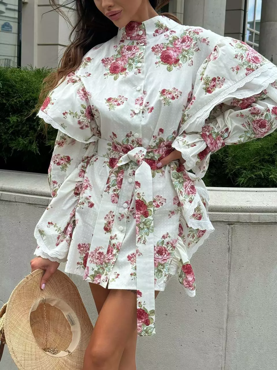 Бавовня сукня в квіти в стилі бохо, декорована прошвою. Має крій прямої сорочки з воланами.