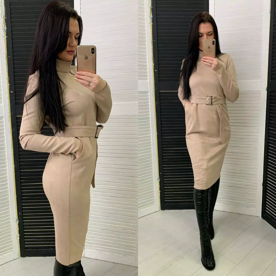 Красива жіноча сукня Diamond - це не просто одяг, це вираз ділової суворості та жіночності в одному Жіноча витончена сукня під горло виготовлена із замші на дайвінгу, має високу талію, краї зрізів не оброблені, застібається на потайну блискавку по спинці Машинне делікатне прання при температурі 30°