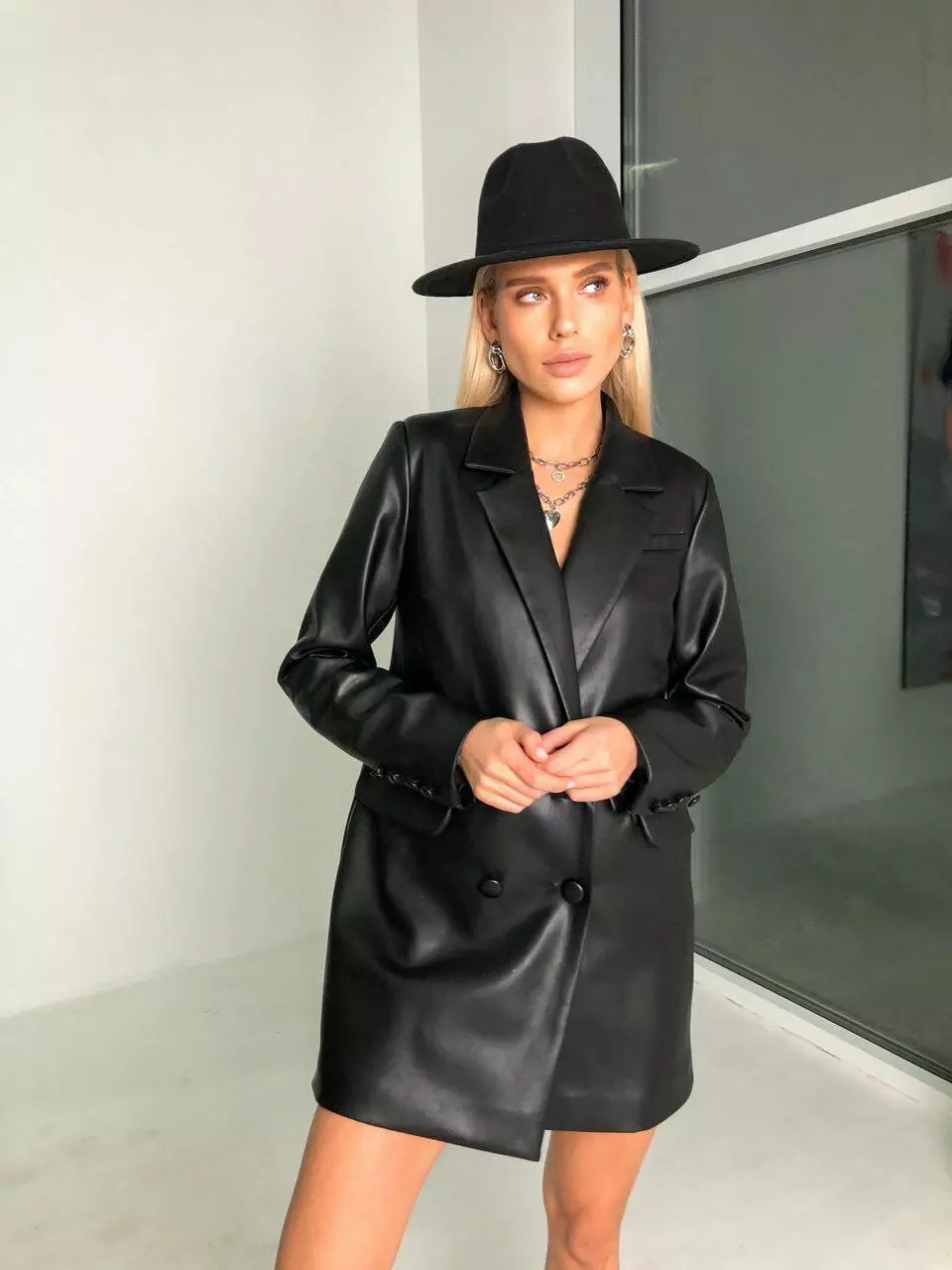 Неймовірно стильна сукня-піджак виконана з екошкіри Lux на замшевій основі Трендовий дизайн, що відповідає останнім модним тенденціям Класична сукня вільного піджачного крою, але злегка приталеного Модель на ґудзиках із коміром та довгими рукавами, має спереду дві кишені клапана