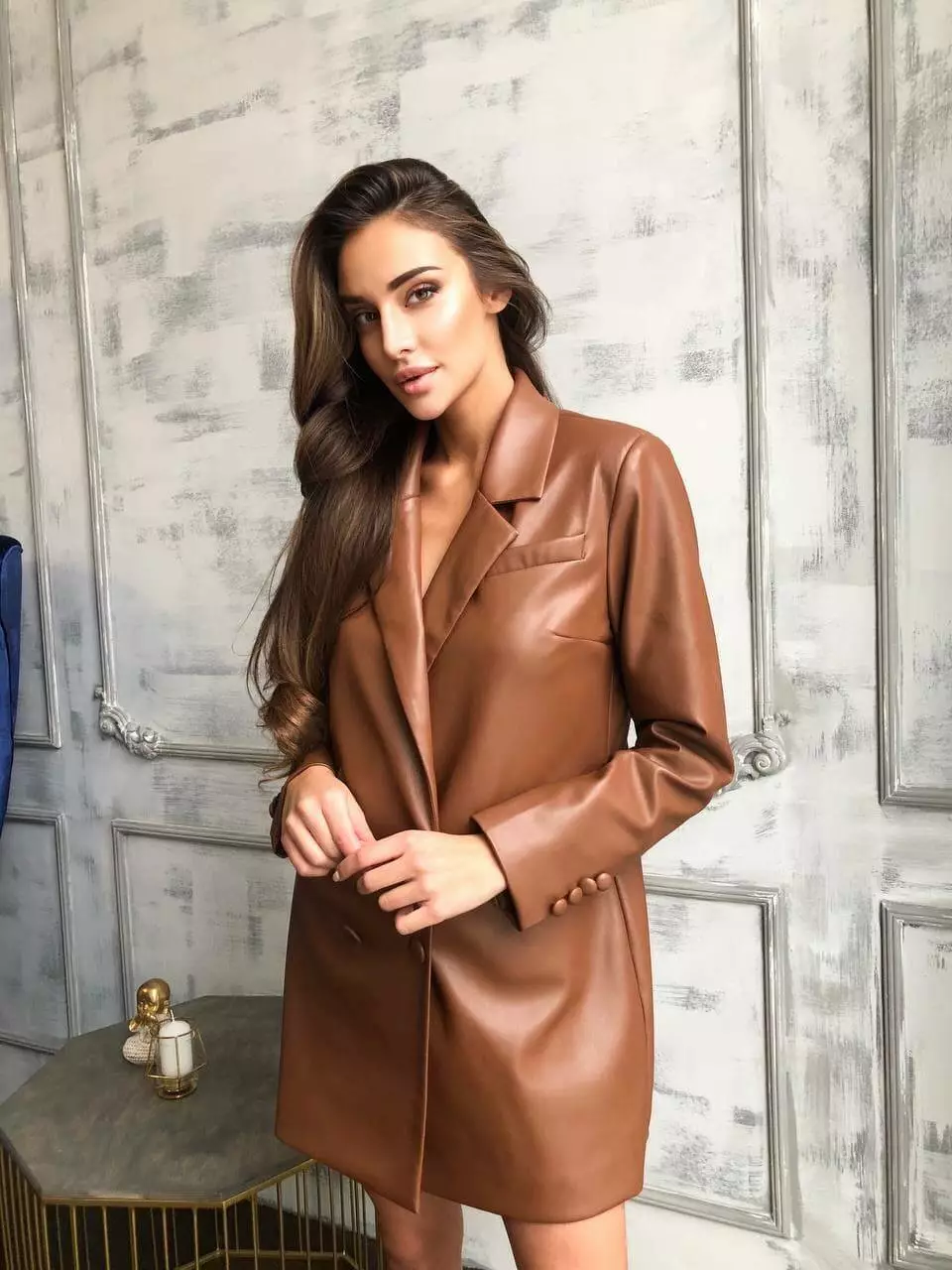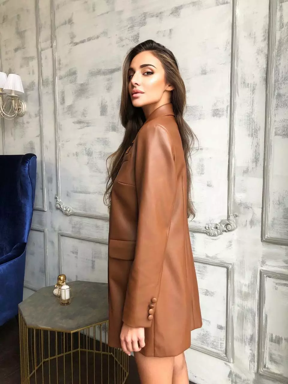 Неймовірно стильна сукня-піджак виконана з екошкіри Lux на замшевій основі Трендовий дизайн, що відповідає останнім модним тенденціям Класична сукня вільного піджачного крою, але злегка приталеного Модель на ґудзиках із коміром та довгими рукавами, має спереду дві кишені клапана