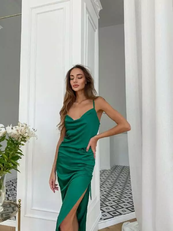 Трендова сукня в стилі slip dress, виготовлена з шовку, спинка гола, бретелі регульовані, в боці по спідниці зав'язка яка регулює розріз!
