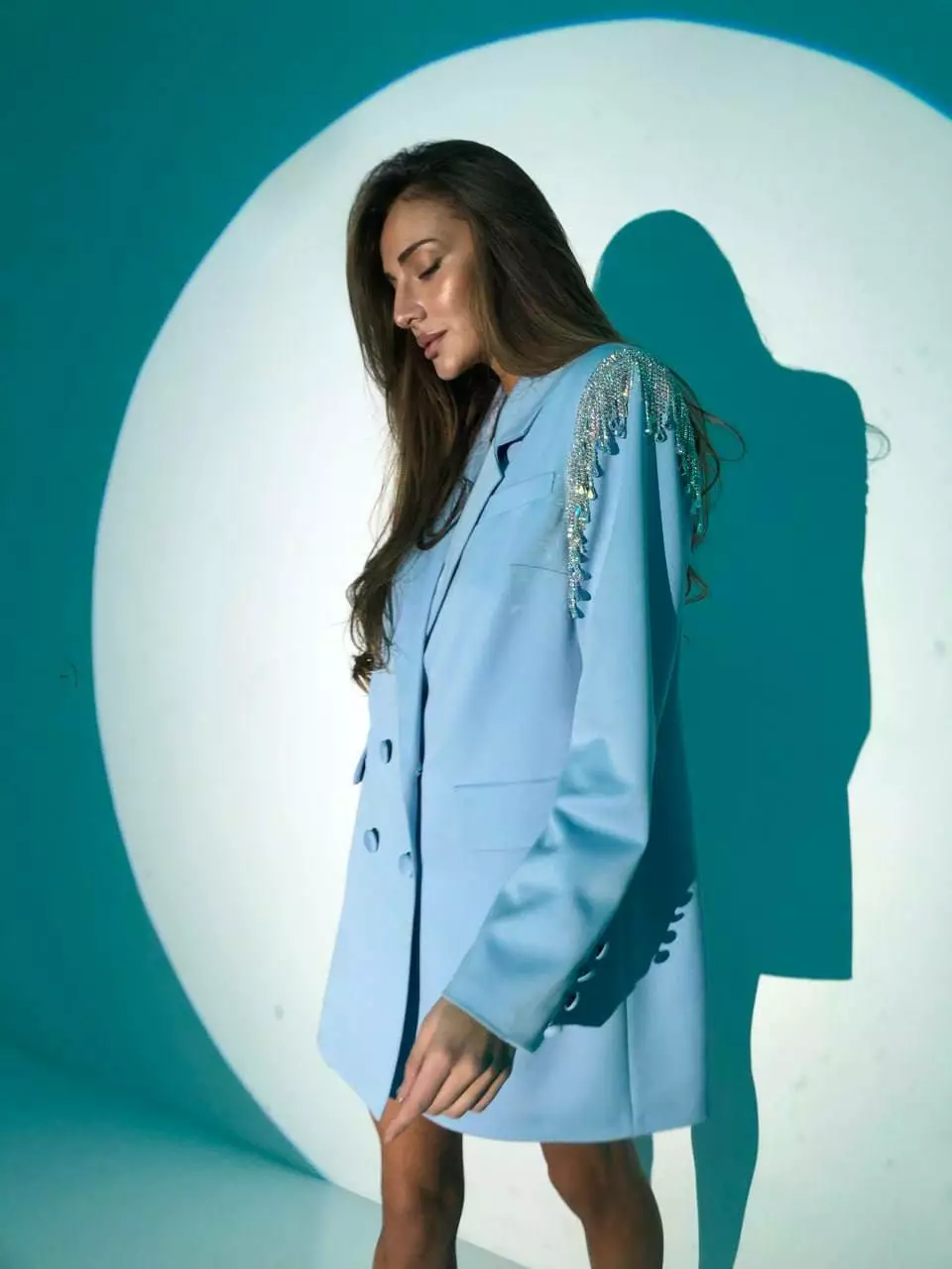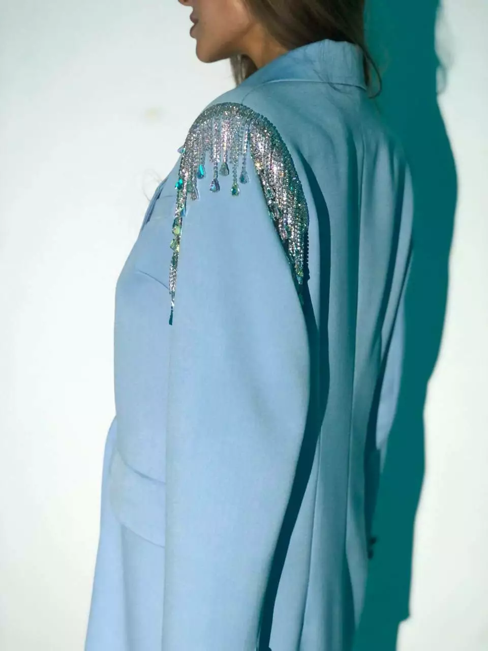 Сукня у піджачному стилі, у люксовому виконанні, виглядає дуже елегантно та розкішно Оригінальний декор на одному з плечі у вигляді стрічки з блискучого каміння пришитим вручну, додає неповторності образу