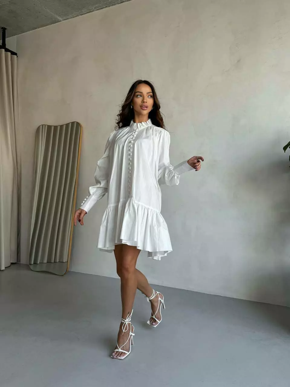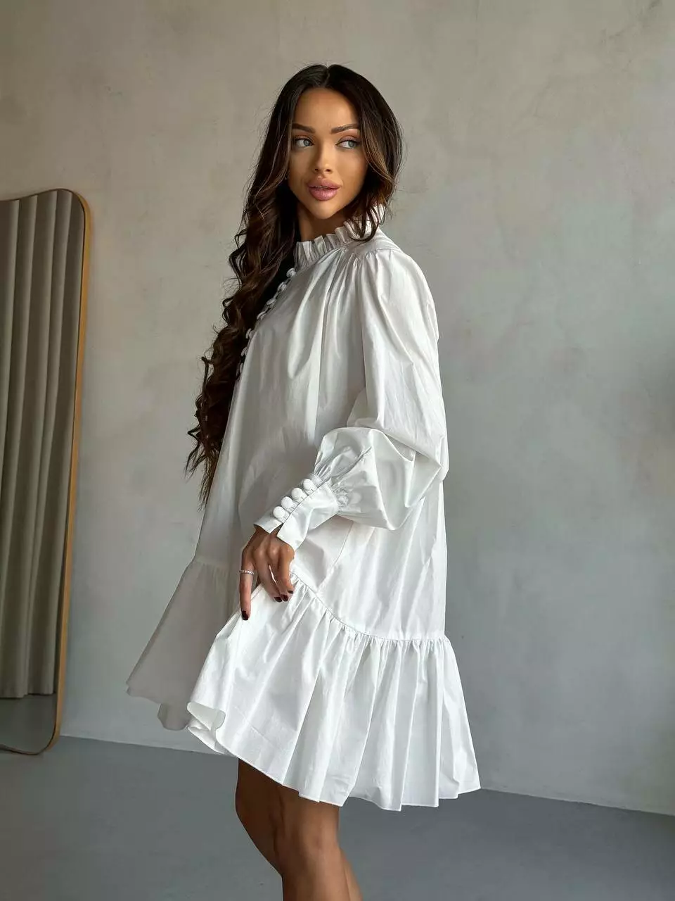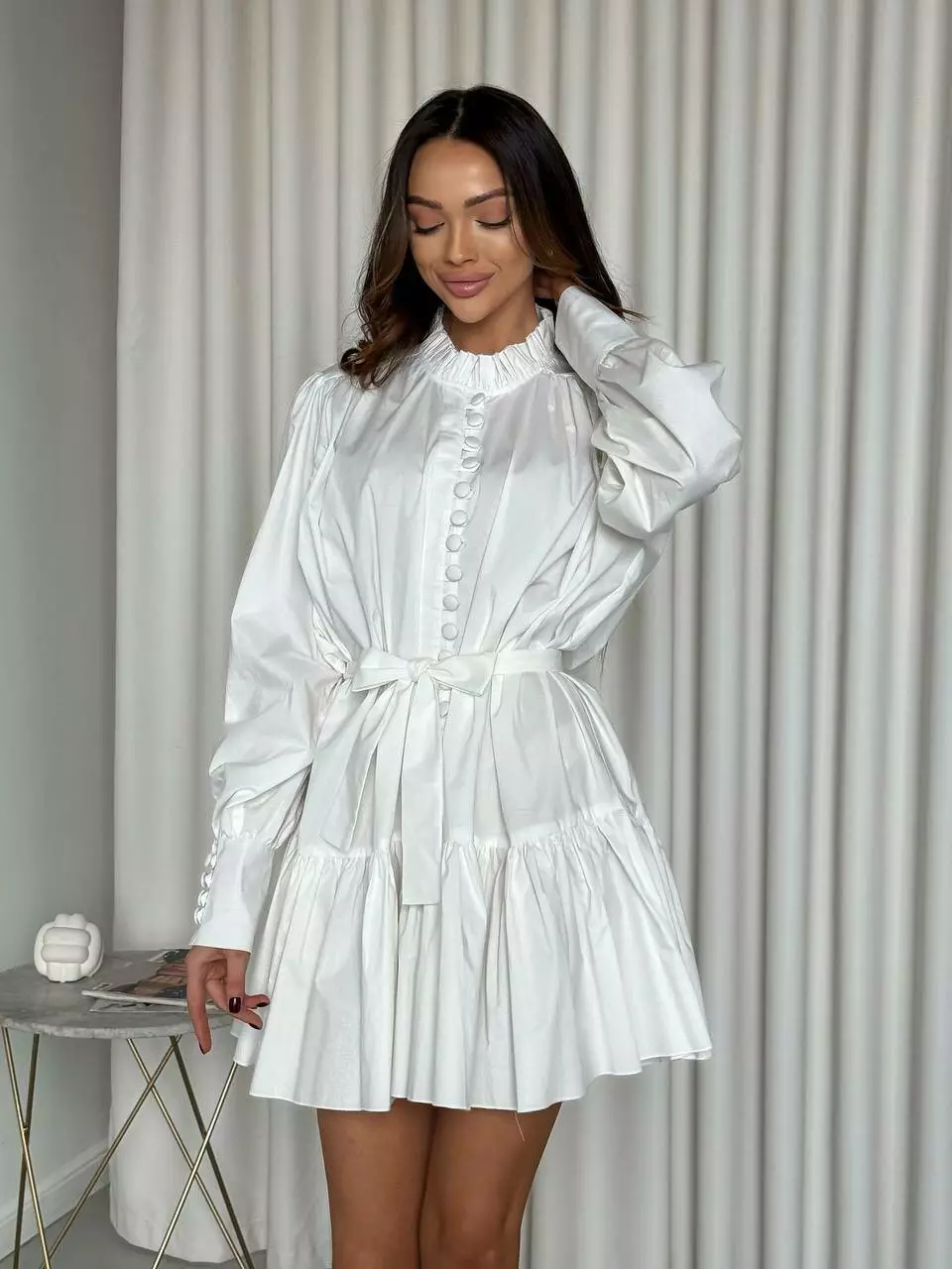 Виконана з якісної бавовняної тканини з безліччю ґудзиків та зборкою по юбці. Пояс в комплекті що легко регулює довжину завдяки напуску.