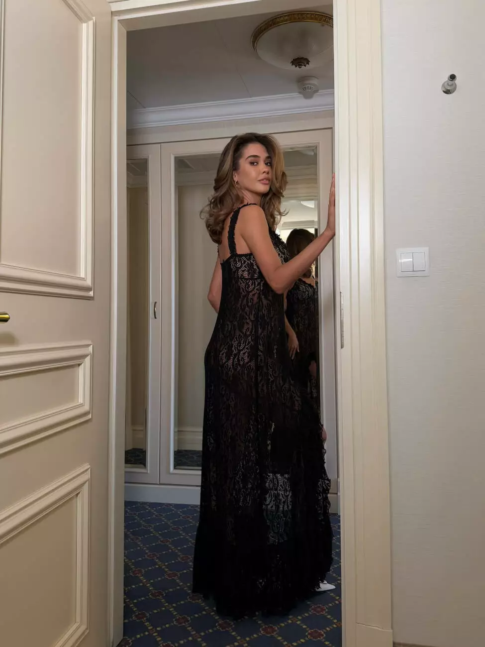Тренд сезону, вишукана сукня з рюшами та воланами, виконана з мережива. Лямки виконані з білизноі резинки, декоровані драпіровкою. По переду пікантний розріз з воланами.