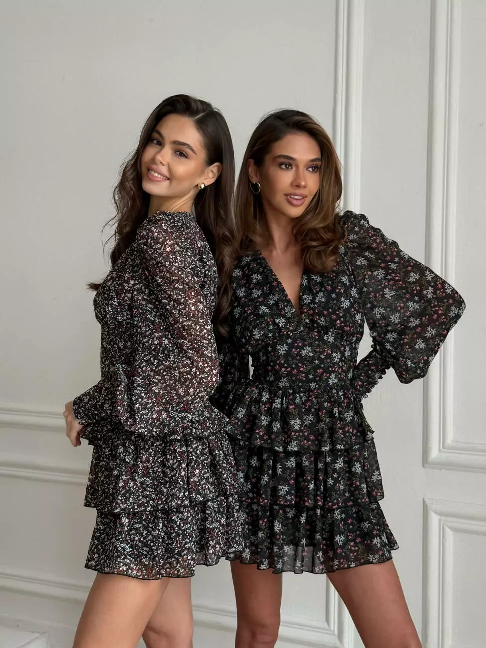 Тендітна повітряна сукня, з V -образним декольте. Талія має ефект утяжки талії, по спинці резинка. Широкі манжети рукавів декоровані ґудзиками обтягнутими в тканину. Спідниця 3 шарова та пишна.