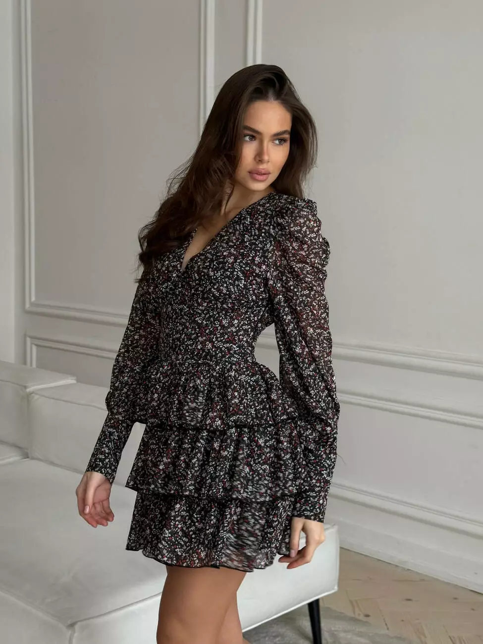 Тендітна повітряна сукня, з V -образним декольте. Талія має ефект утяжки талії, по спинці резинка. Широкі манжети рукавів декоровані ґудзиками обтягнутими в тканину. Спідниця 3 шарова та пишна.