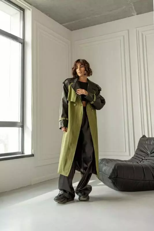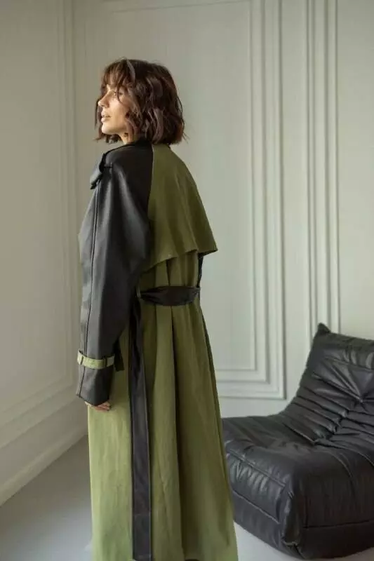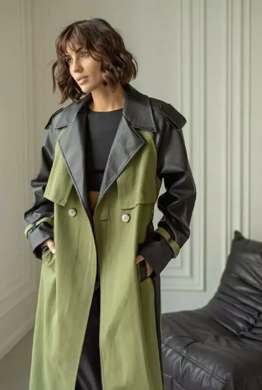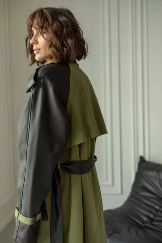 Однобортний, комбінований тренч з екошкіри та бавовни, оснащений функціональним розрізом ззаду, застібається на ґудзик та однотонний пояс зі екошкіри, який дозволяє зробити акцент на талії, щоб силует став ще жіночнішим Матеріал: бавовна + екошкіра Розмір: S/L