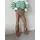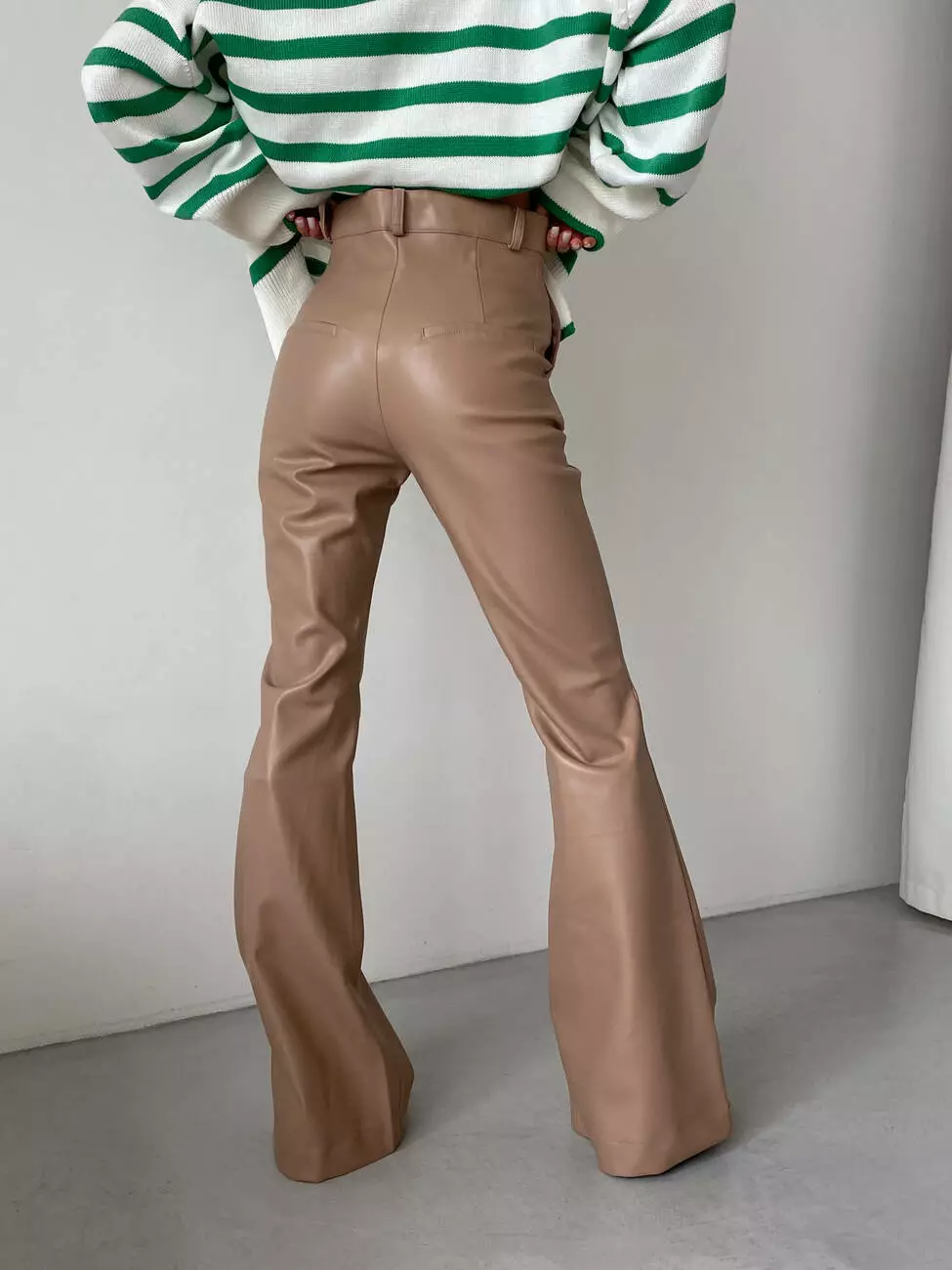Модель має високу посадку з двома робочими кишенями, клешені, вільні штани (не в обліпку), а клеш йде від коліна.
