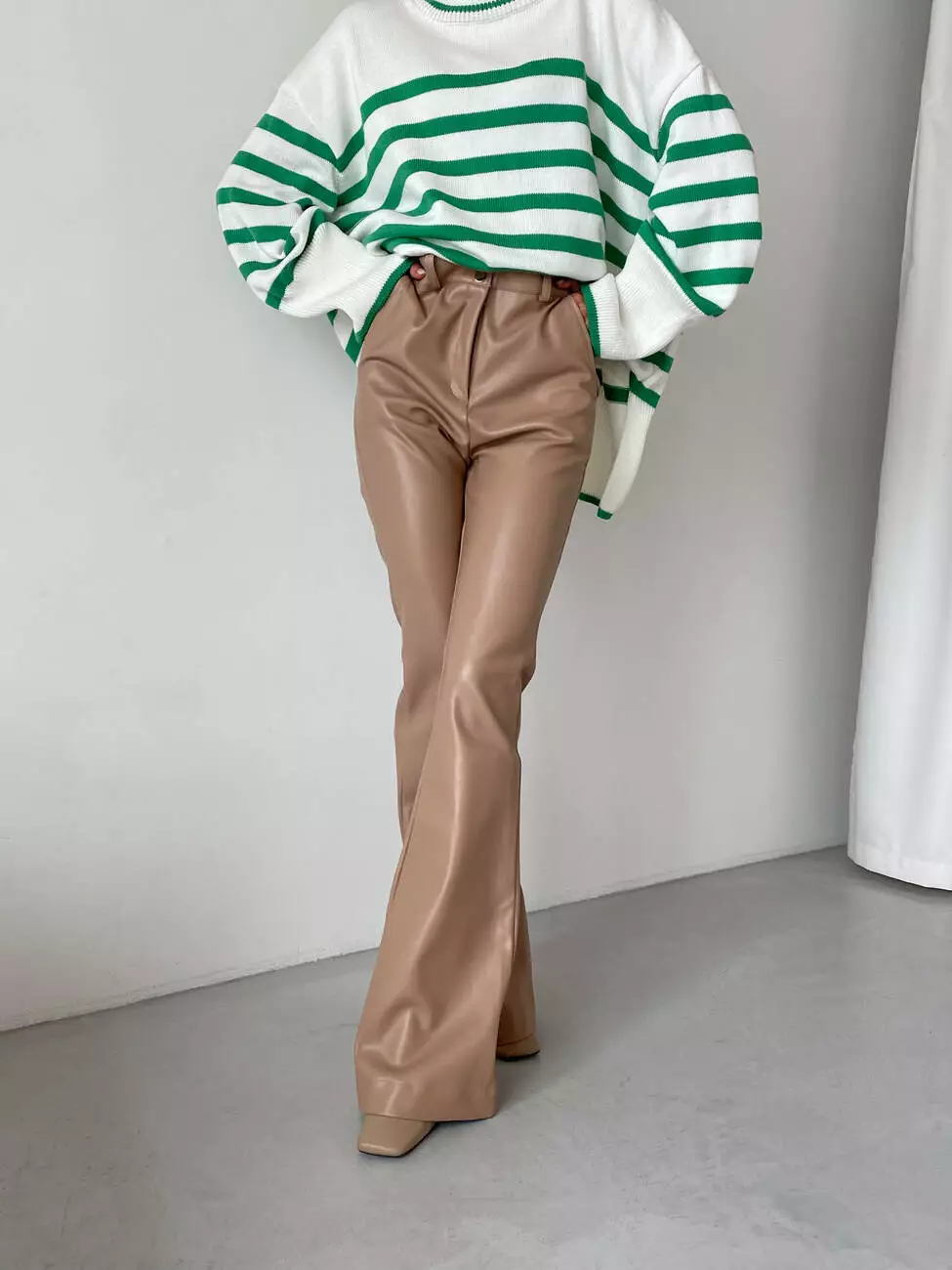 Трендові брюки STREET з екошкіра LUX на замшевій основі клешені від коліна бежевого кольору