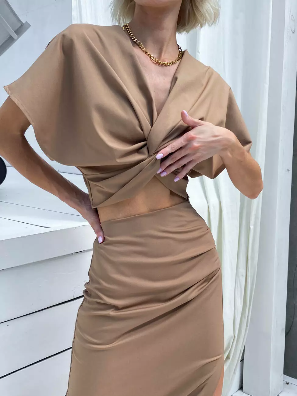 Вишуканий костюм MON CHERY топ без рукавів та спідниця міді з розрізом колір капучино