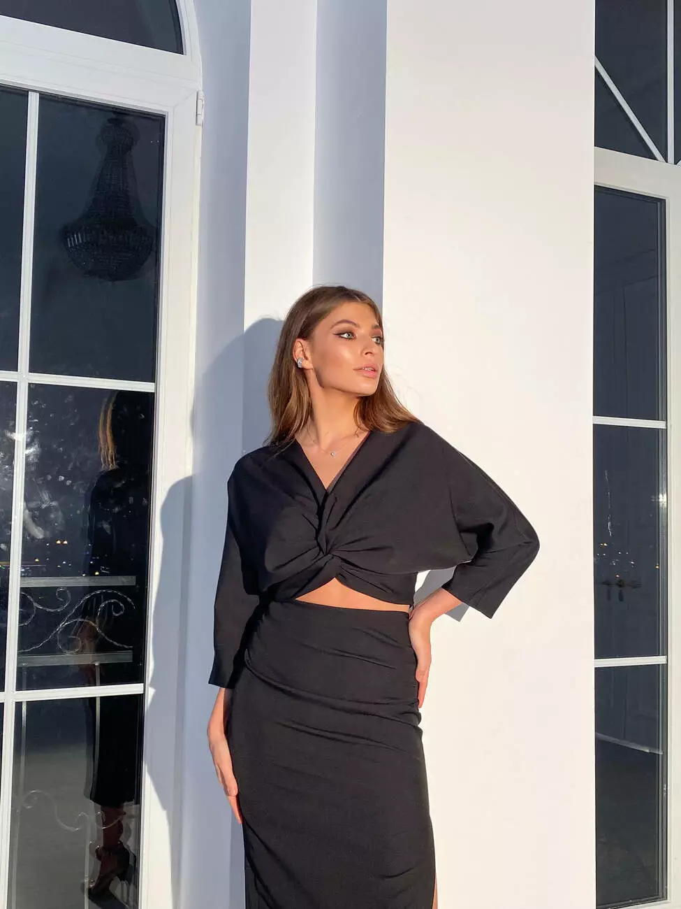 Топ з палітуркою та спідниця міді зі складанням та розрізом на