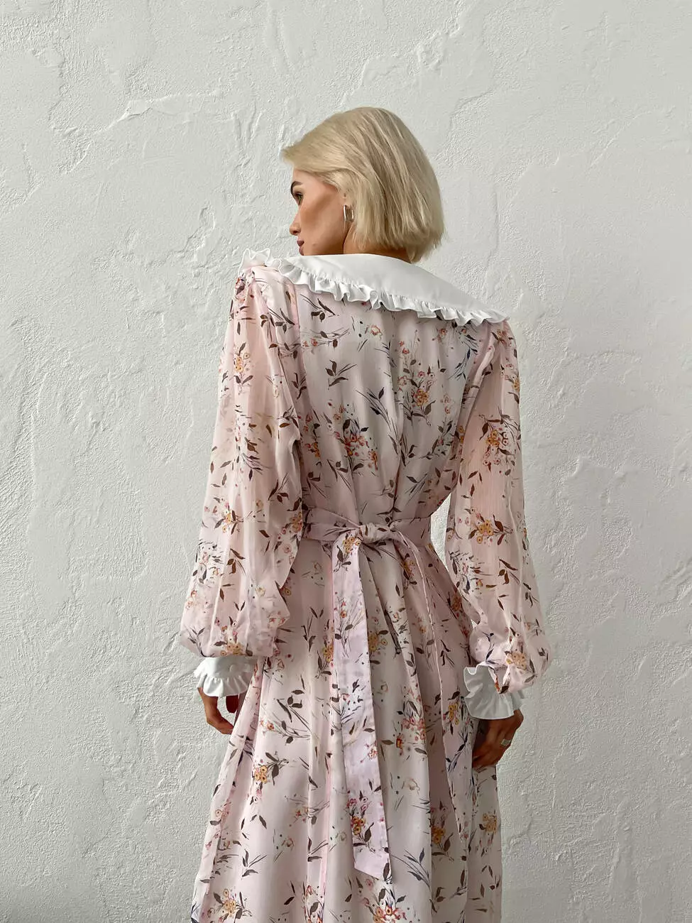 Жіноча шифонова сукня VENETTA з білим комірцем довжини міді з квітковим принтом пудрового кольору