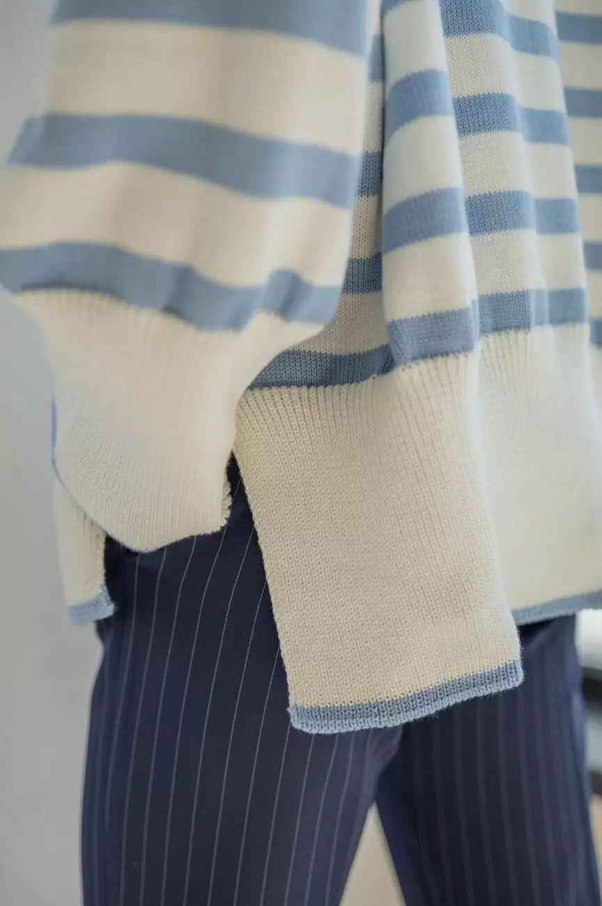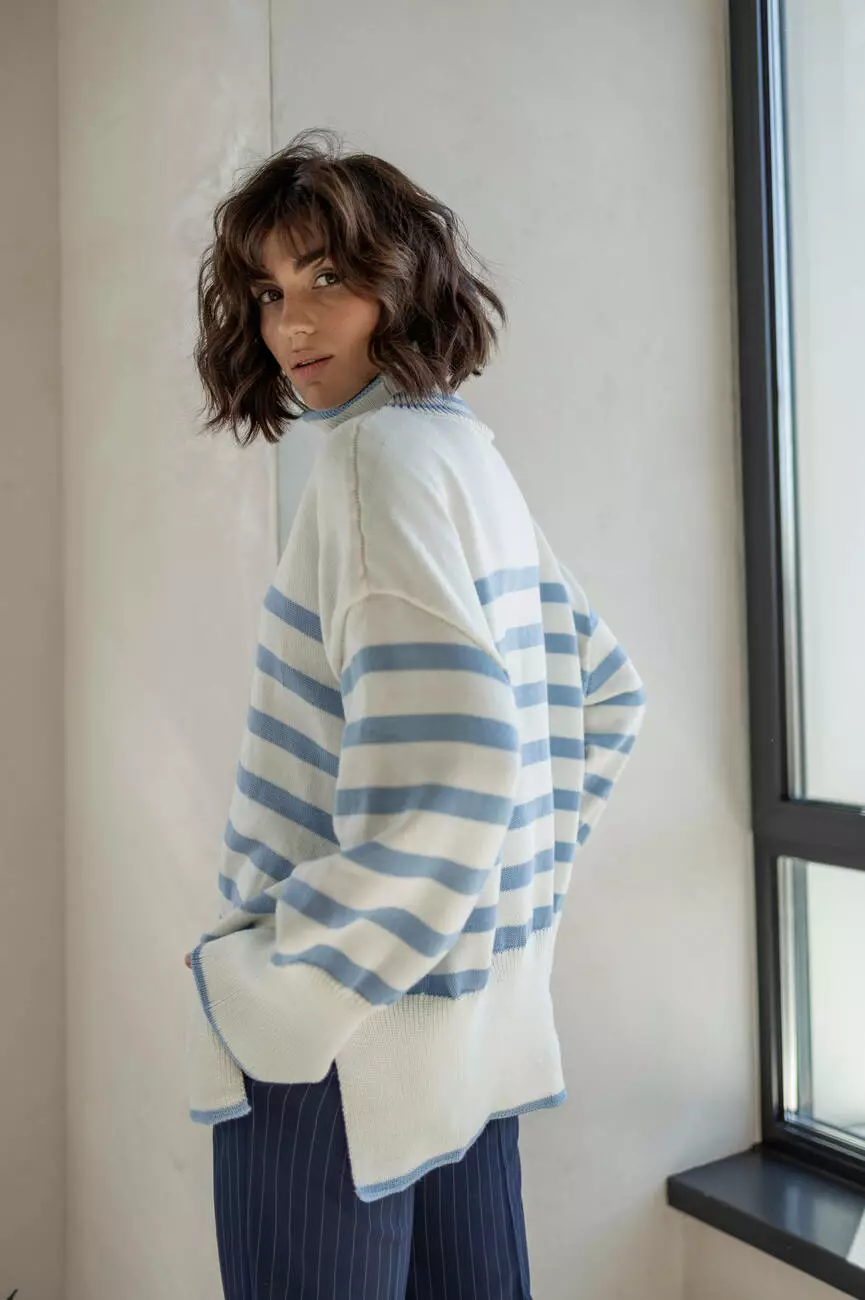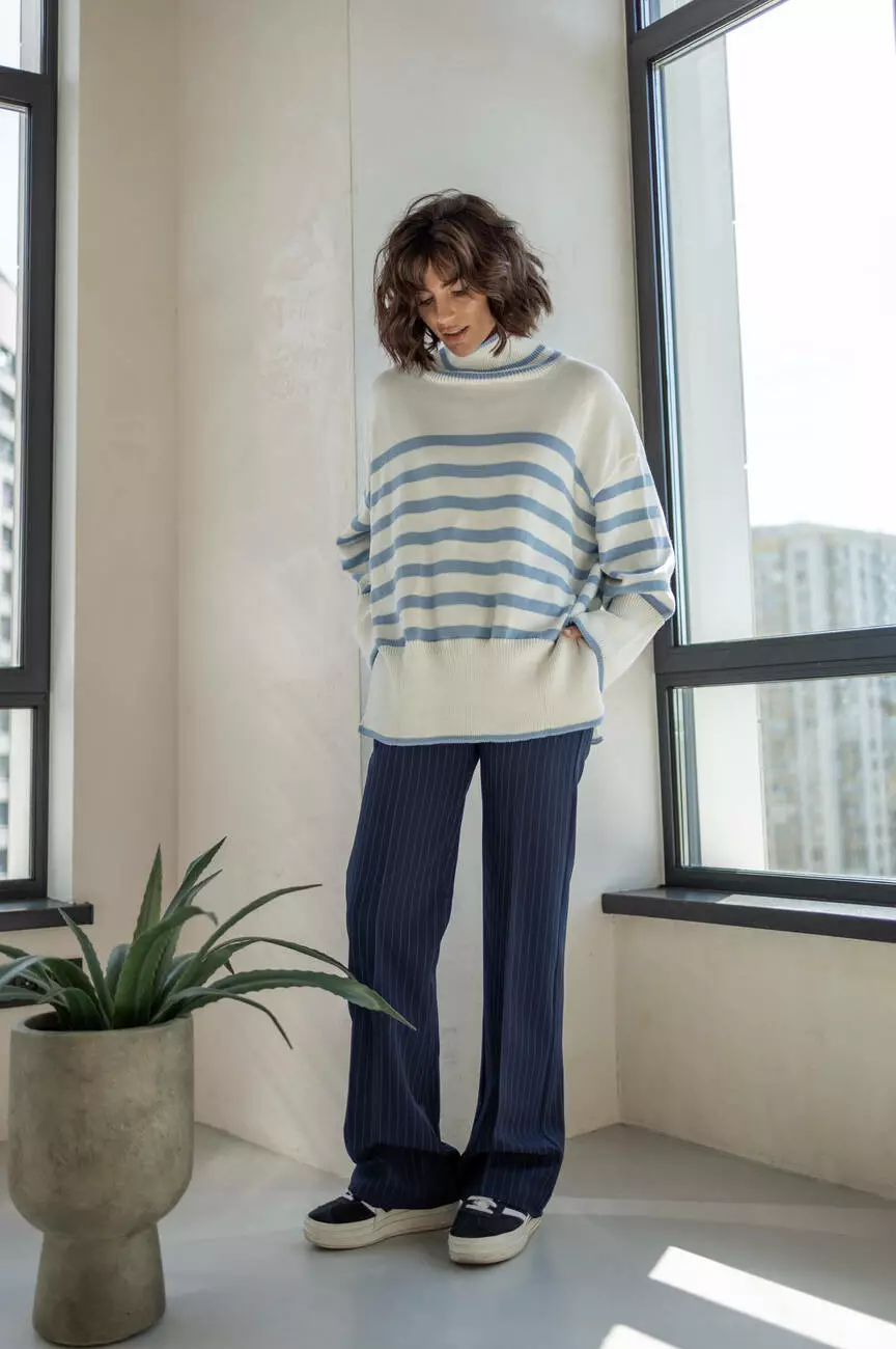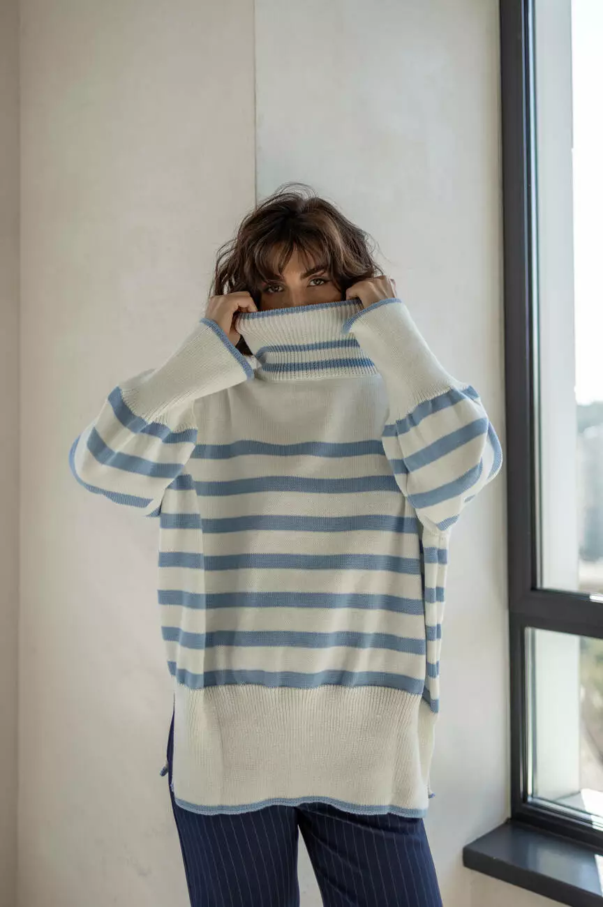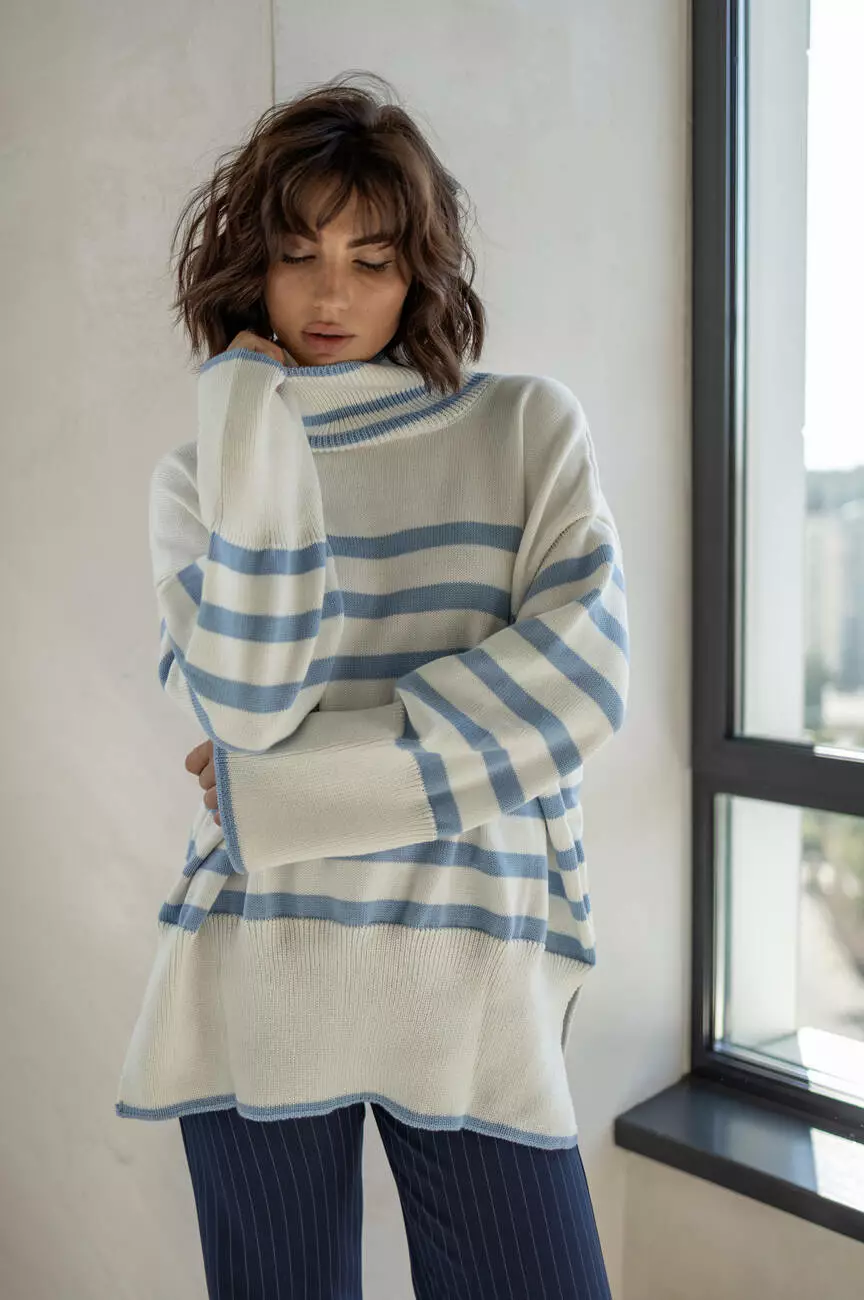 Подовжений светр у смужку має довгі широкі рукави з манжетами, високу горловину та манжет по низу виробу.