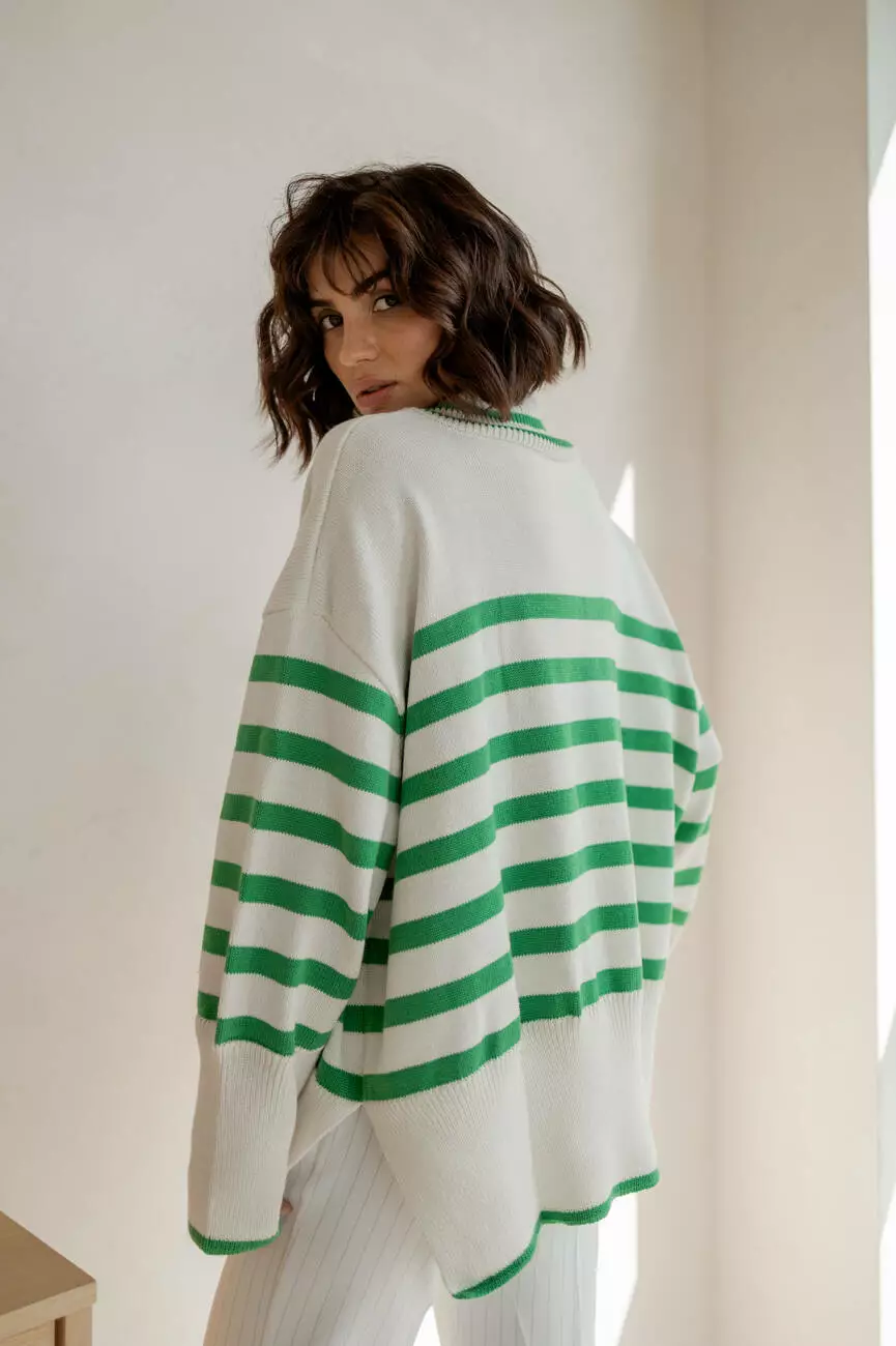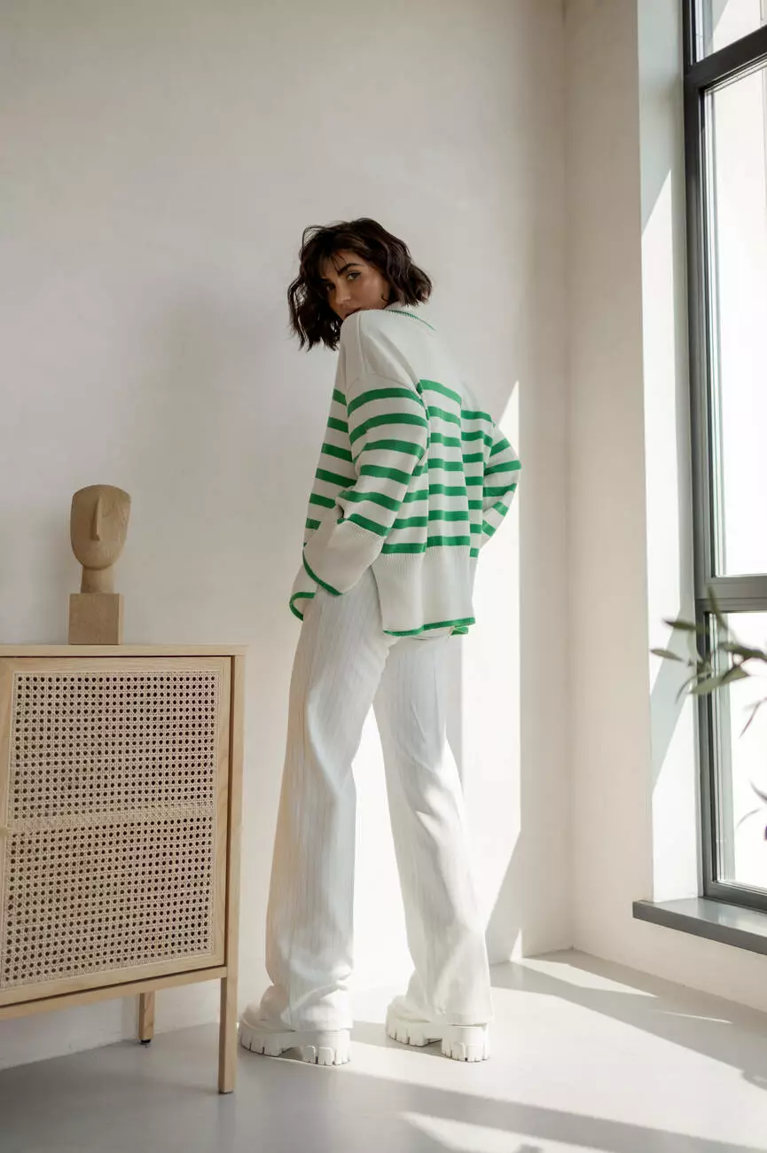 Жіночий бавовняний светр Тільняшка в смужку під горло колір молоко-трава