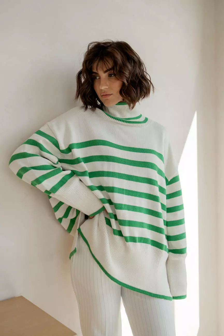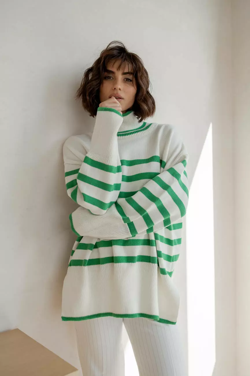 Подовжений светр у смужку має довгі широкі рукави з манжетами, високу горловину та манжет по низу виробу.