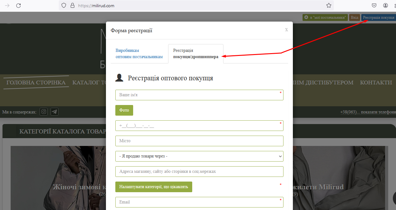 1. Зареєструйтесь на сайті https://milirud.com як оптовий покупець/дропшипер: